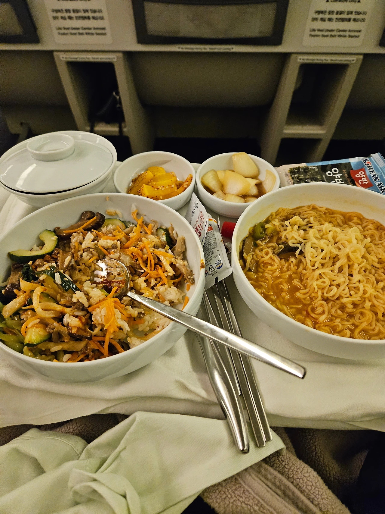비지니스는 처음이라, 너무 황송해서 이걸 대접을 받으며 먹어도 되는 건가 싶었다. 차라리 마음 편하게 일반석으로 가서 도시락 같은 걸 하나 먹는 게 마음이 더 편할 것 같다는 생각까지 들었다. 아직 고귀한 대접에 익숙하지 못한 일반인인가 보다. 그래도 180도로 누워서 갈 수 있다는 것의 메리트가 정말 엄청났다. 그러면서 일반석에서도 단차를 두고 3층 침대처럼 눕힐 수 있으면 어떨까라는 생각도 한 번 해 보았다.