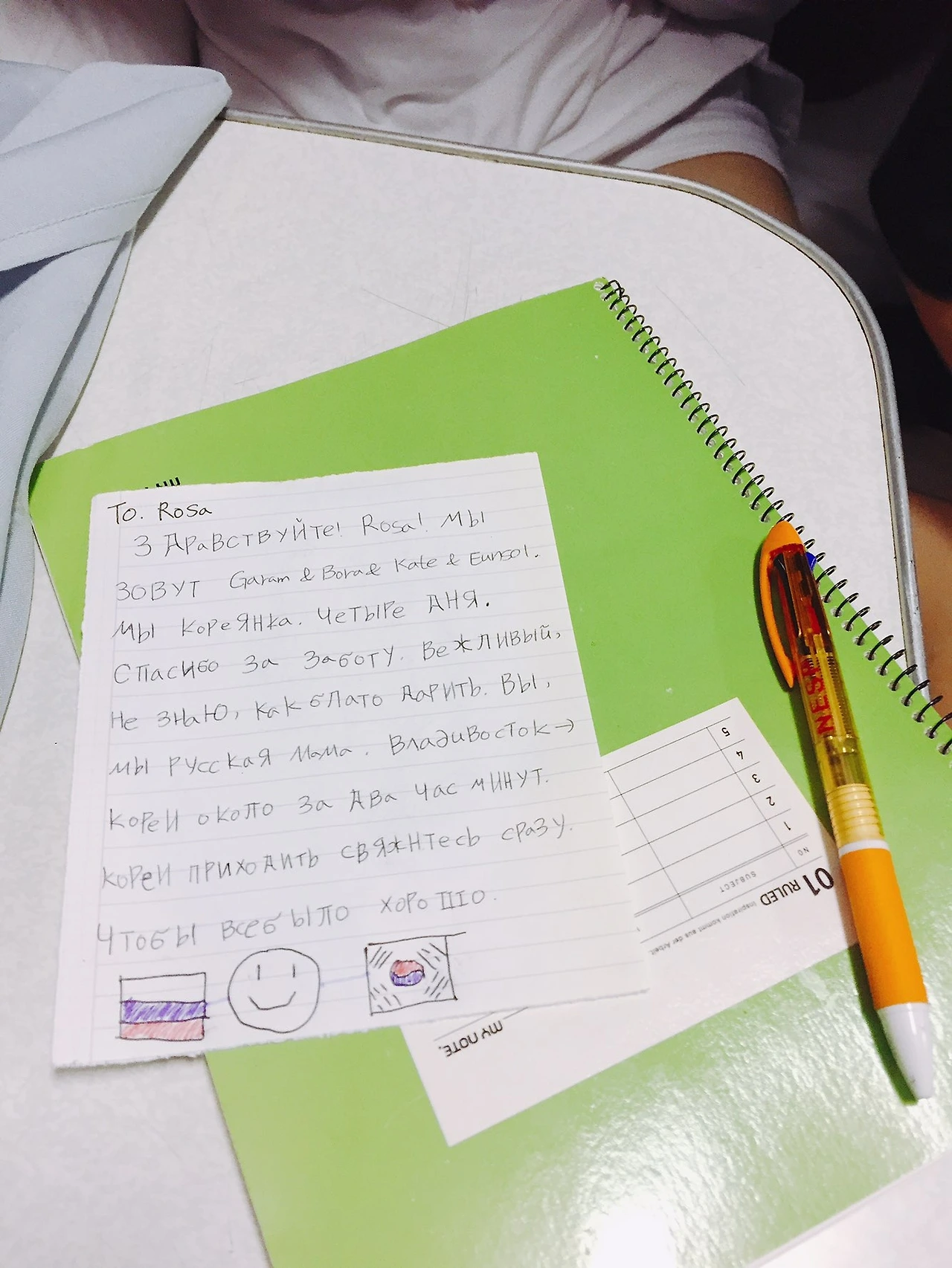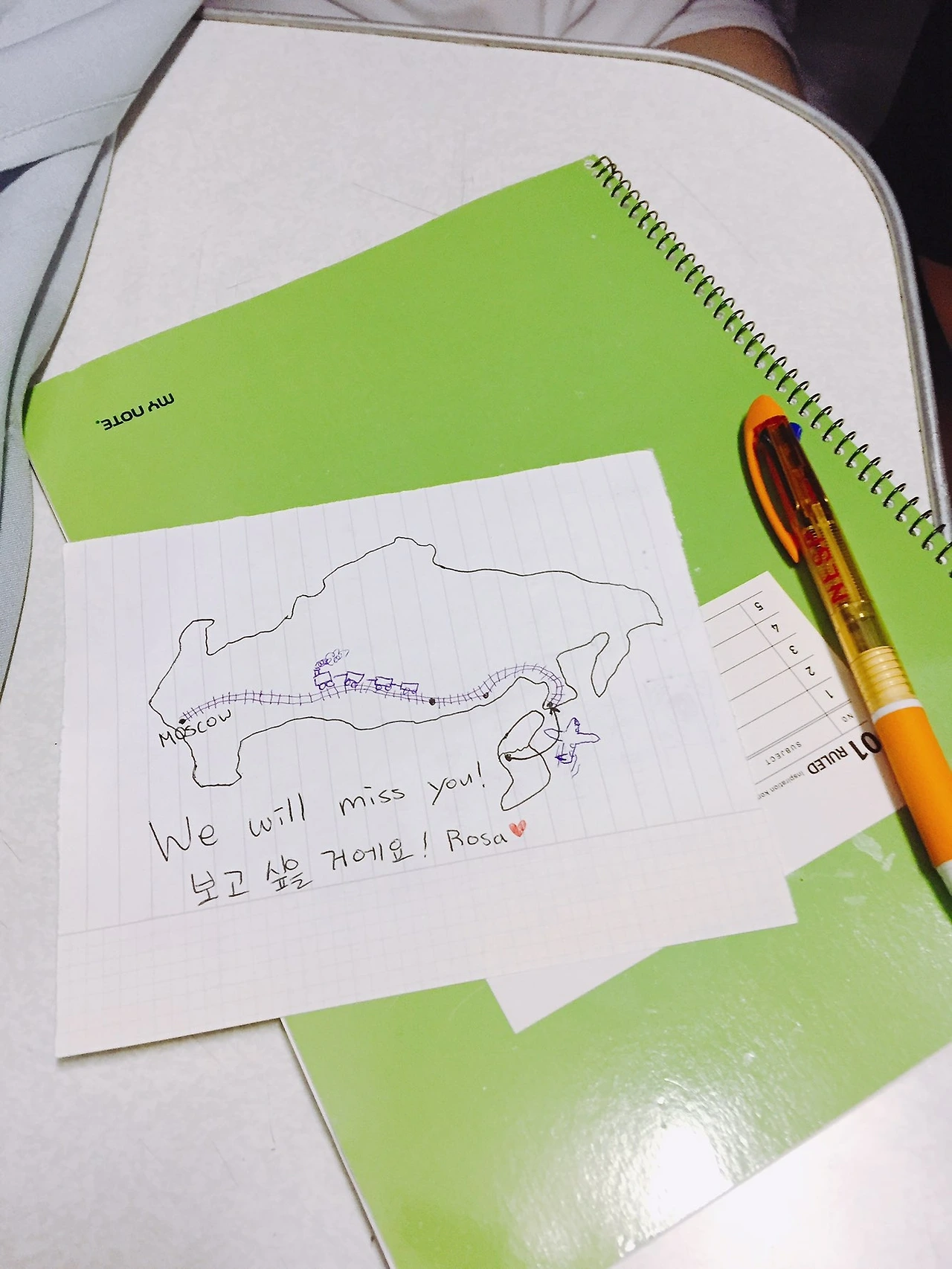 기차에서 내릴 시간이 되었고, 우리는 다행히 높은 사람에게 잘못 발권한 사실을 들키지 않았다. 차장엄마에게 우리의 감사한 마음을 전하고 싶었다. 그렇게 우리는 휴대폰도 터지지 않는 곳에서 러시아어 회화책에 의존해 편지를 썼다. "당신은 우리의 러시아 엄마예요. 고마워요"라고 쓰고 싶었지만 우리의 한계는 '당신, 우리, 러시아인, 엄마, 고마워요'였다.