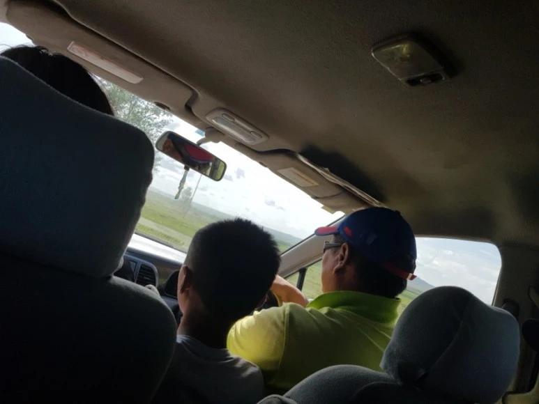 그 아줌마는 우리에게 남은 러시아 루블과 달러 일부를 몽골 돈으로 다 바꿔주었다. 그리고 환율을 계산해보니 거의 95%로 쳐주었다. 그래서 사실 다 바꿔버렸다. 그리고 4명, 총 12만원을 계산해서 냈다. 일반 소형 SUV 뒷자리에 4명이 끼여서 앉아서 가야 했다. 정말 허리가 뿌서질 뻔 했다. 그 차에는 아저씨, 아줌마, 그리고 초등학생 3학년 쯤 된 듯한 아이가 탔다. 자기들끼리 뭐라고 하더니 아이가 갑자기 차에서 내려 트렁크를 연 뒤 그곳에 탑승한다. 뭔가 우리 때문에 불편하게 가는 것 같아서 아이에게 미안했는데, 오히려 아이는 동양인들을 태운 것이 신기하고 재미있어 보였다.