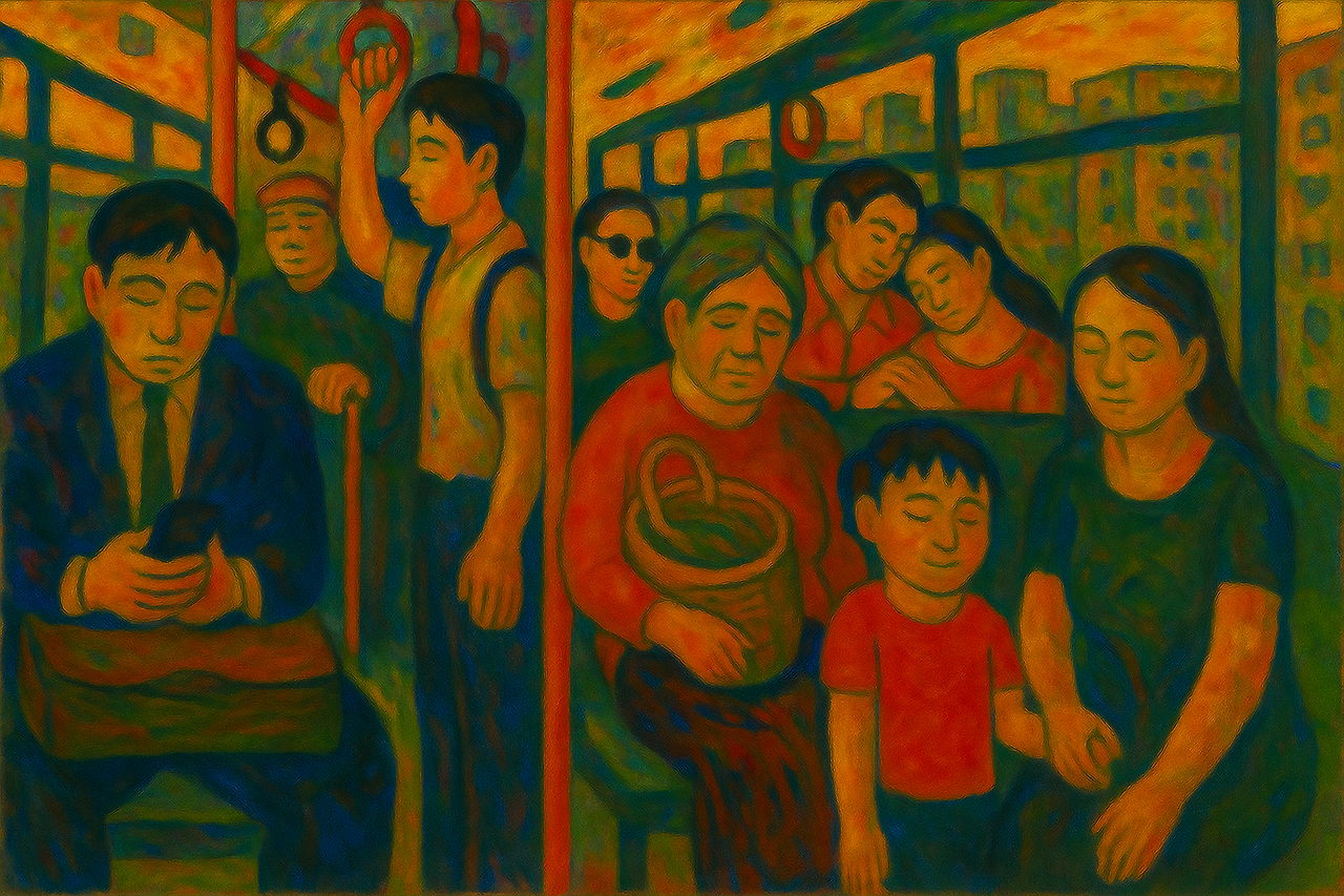 <버스 탄 사람들>은 이런 버스 안의 인간적인 분위기를 다양한 삶의 모습을 한 승객들을 통해 표현하고 있습니다. 작품을 보시면, 참 다양한 얼굴들이 있죠. 무거운 책가방을 맨 학생, 미처 확인 못한 연락들에 답장하는 직장인, 지팡이를 든 할아버지, 한껏 멋을 낸 청년, 사랑을 속삭이는 연인, 저녁거리가 든 장바구니를 꼭 쥔 아주머니, 그리고 아이의 재잘거림을 미소로 듣고 있는 어머니까지. 각자의 목적지는 다르지만, 버스 안의 공통된 시간과 공간이 서로 다른 사람들의 삶을 교차시키고 있습니다.