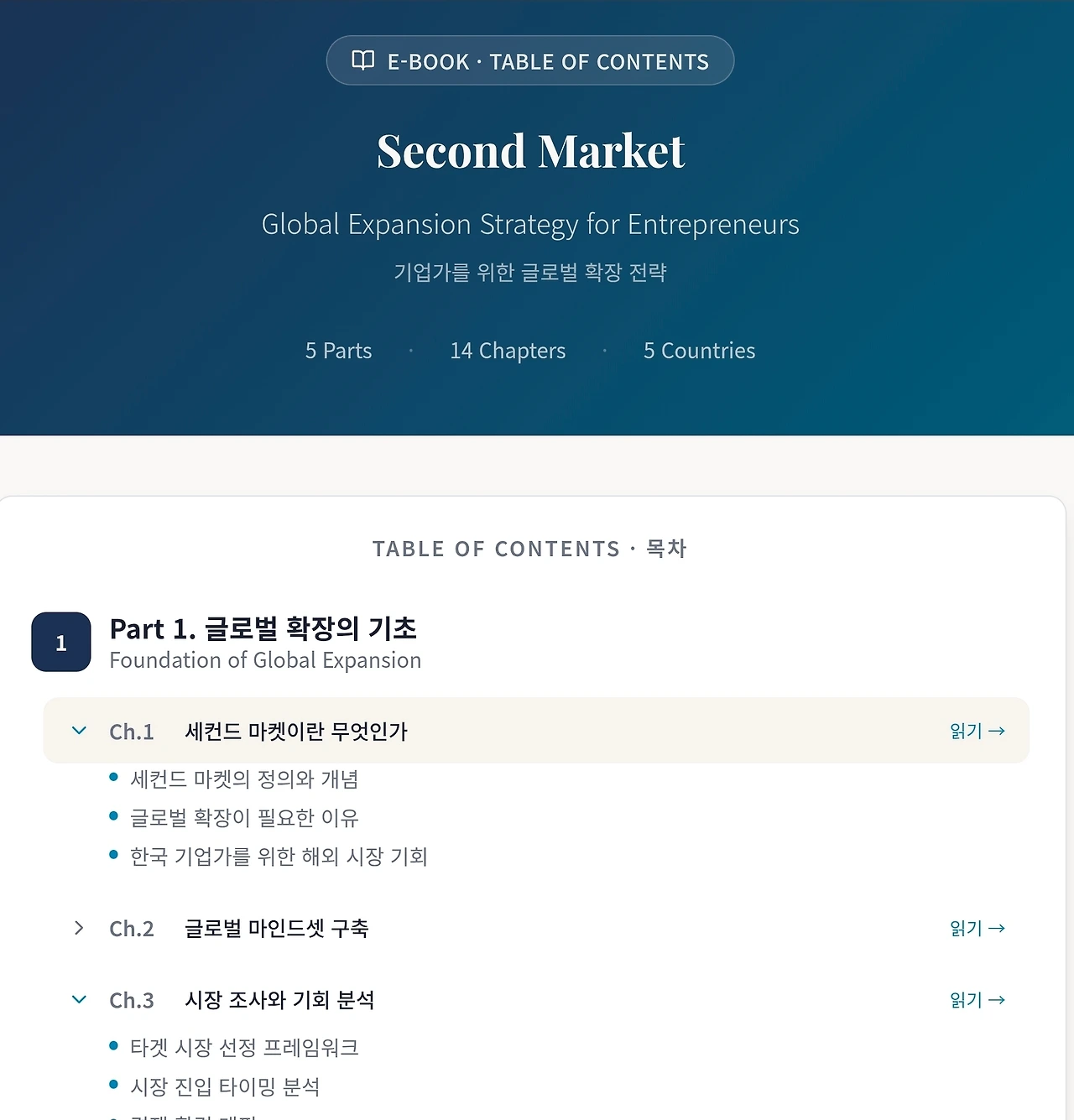 해외진출은 더 이상 먼 미래의 계획이 아니다. 두 번째 시장은 이미 존재하고 있으며, 필요한 것은 그것을 연결하는 전략뿐이다. 세컨드마켓은 바로 그 연결을 위한 하나의 출발점으로서 읽어보기를 권한다.