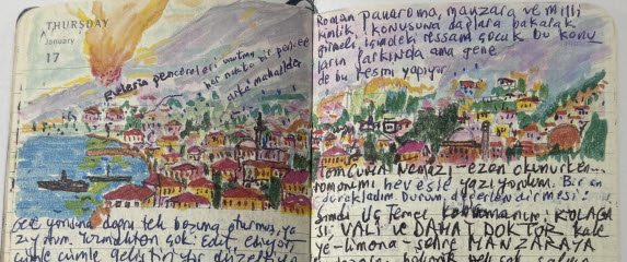 책장을 폈을 때, 글보다는 그림이 먼저 마음에 들어왔다. 색채. 아주 다양한 색채를 썼고 기본적으로 색감이 화려하고 강렬하다. 수첩에 끄적거린 것이라고 생각하기엔 무척 꼼꼼한 그림이 시선을 사로잡아서 글씨가 눈에 잘 들어오지 않는다. 작은 그림이지만 구도도 완벽하다. 대부분이 풍경화이다. 그의 색채에 대한 사랑은 그림에서뿐만 아니라, 매 페이지의 문장을 상당히 자주 다른 색깔의 필기구로 써 내려갔다는 것에서도 알 수 있다. 파묵의 필통과 화구가 어떤 것일지 정말 보고 싶다.