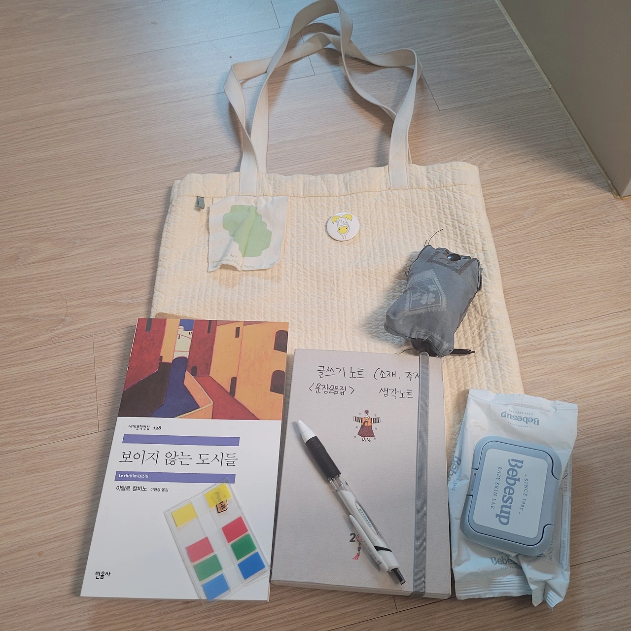 나이를 먹으면 남의 시선이 크게 신경이 안 쓰이는 건지 나는 요즘 에코백이 제일 좋다. 우선 가볍다. 잃어 벼려도 크게 아까운 마음이 들지 않는다. 가방이 어쩌다 비를 맞아도, 뭐가 묻어도 “빨면 되지 뭐” 하고 툭툭 털어버린다. 사물에 대한 속박에서 벗어나니 가벼운 마음이 들었다.