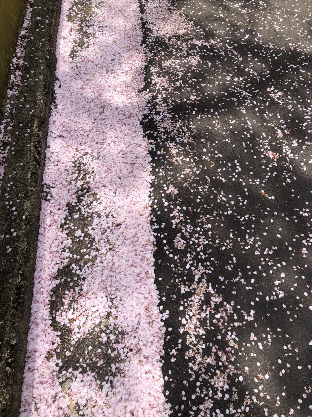 정말로 꽃길만 걸어서 도착한 숲 속. 나는 벤치에 누워 꽃비를 맞았다. 돌아가는 길, 무릎 위에 붙어있는 연두색 애벌레 한 마리를 발견. 아마도 꽃비가 떨어질 때 내 몸 어딘가에 붙어서 온 모양이다.