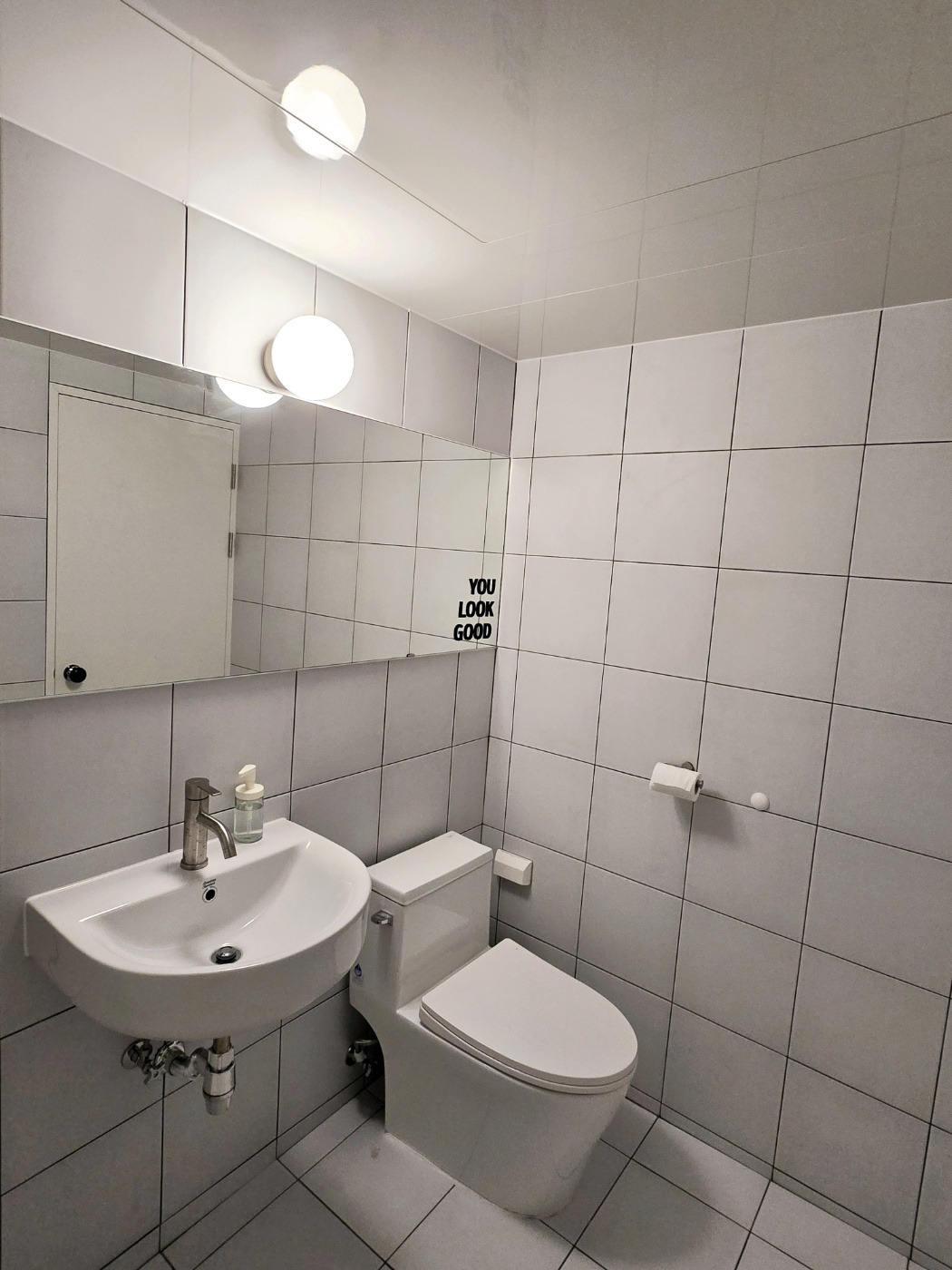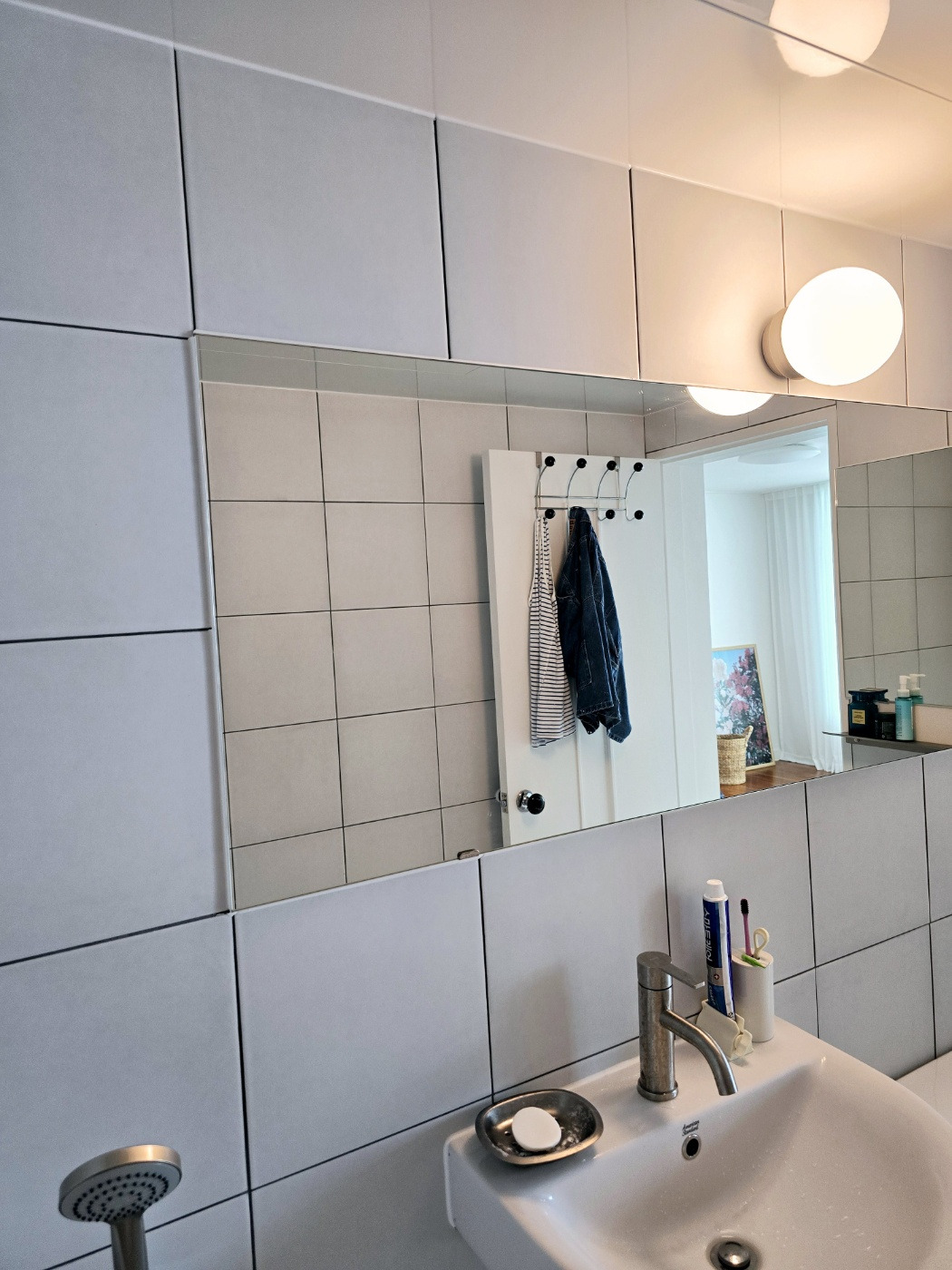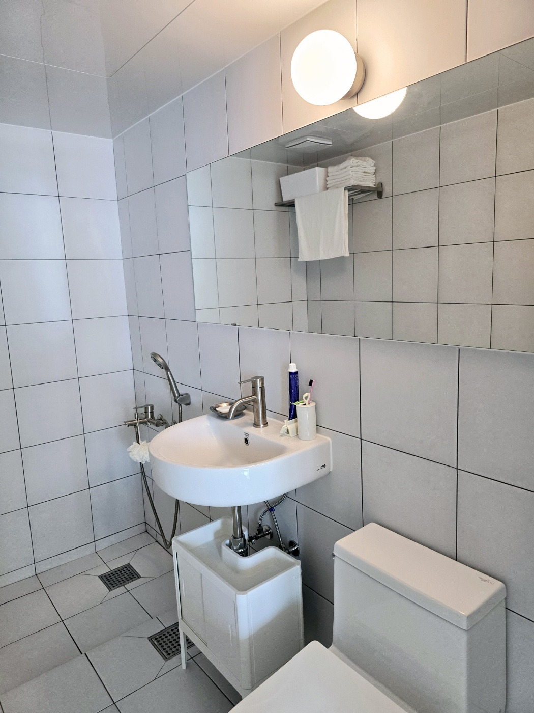 화이트 타일로 골랐으나 조명을 받으면 그레이가 되는 타일이 깔린 문제의 욕실. 욕실은 최대한 심플했으면 했다. 그래서 바닥과 벽을 동일한 타일을 쓰고 수납장도 없앴다. 멋과 끼를 배제한 공중 화장실 같은 느낌으로.