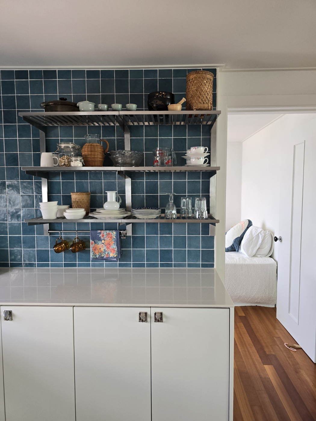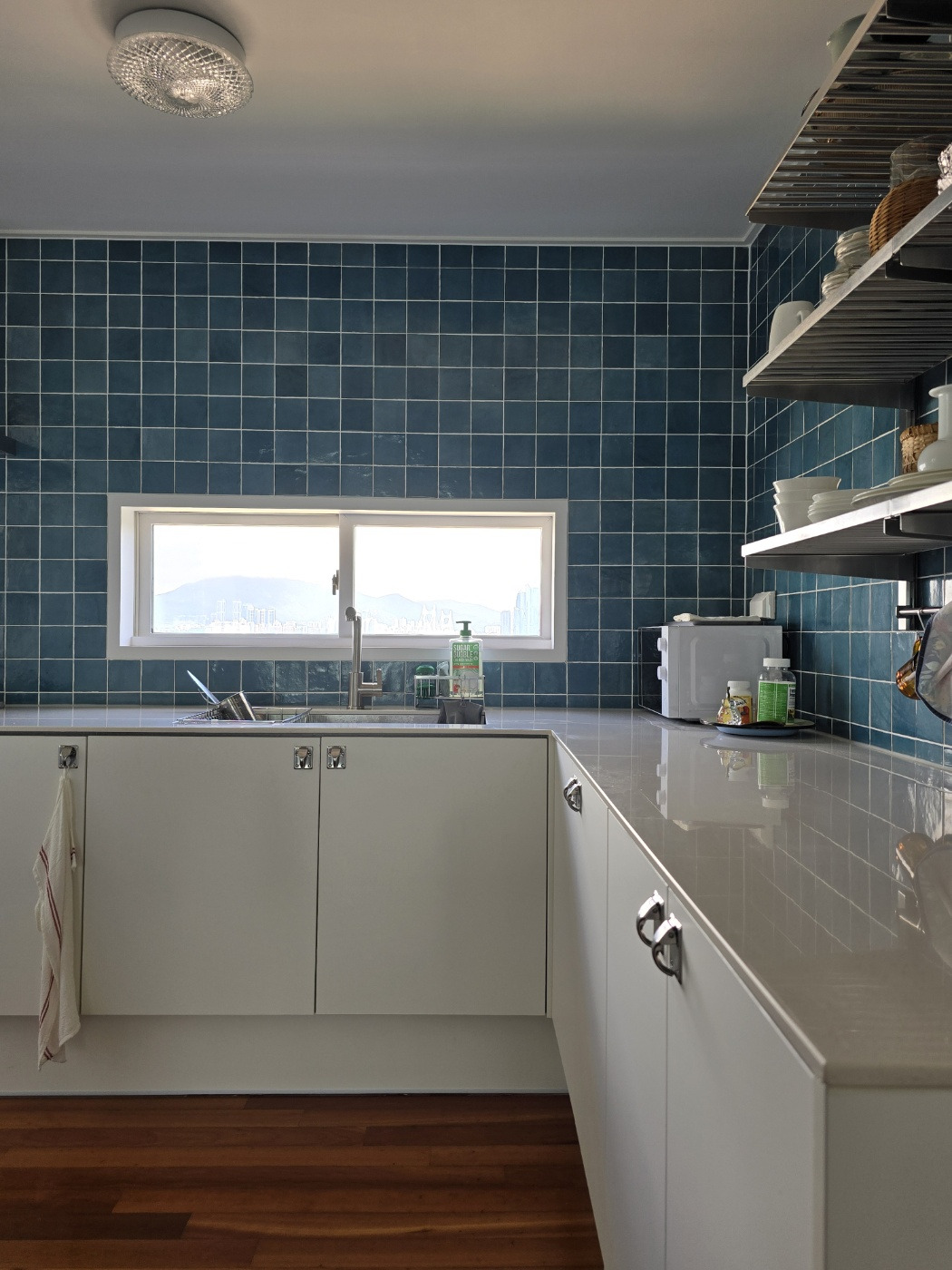 제일 신경을 많이 쓴 공간은 주방. 그동안의 생활 패턴을 봤을 때 거실보다는 주방에서 보내는 시간이 가장 많았다. 주방이 가장 아름다웠으면 했고 전의 집과는 완전히 달랐으면 했다. 그래서 고른 것이 푸른 바다를 떠올리게 하는 타일이었다.