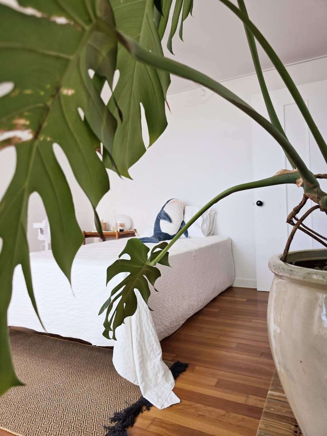 침실은 오로지 잠만 자는 곳이라 화장실 딸린 넓은 안방을 드레스 룸으로 쓰고 그다음으로 넓은 방을 침실로 가장 작은 방은 서재로 사용한다. 창밖 풍경을 한참 바라보다가 내 친구 상어를(그렇다. 이제 내 친구가 되었다.) 껴안고 잠이 든다. 이사하면서 몬스테라 이파리가 많이 상해서 앙상해졌지만 곧 새 이파리를 내놓겠지.