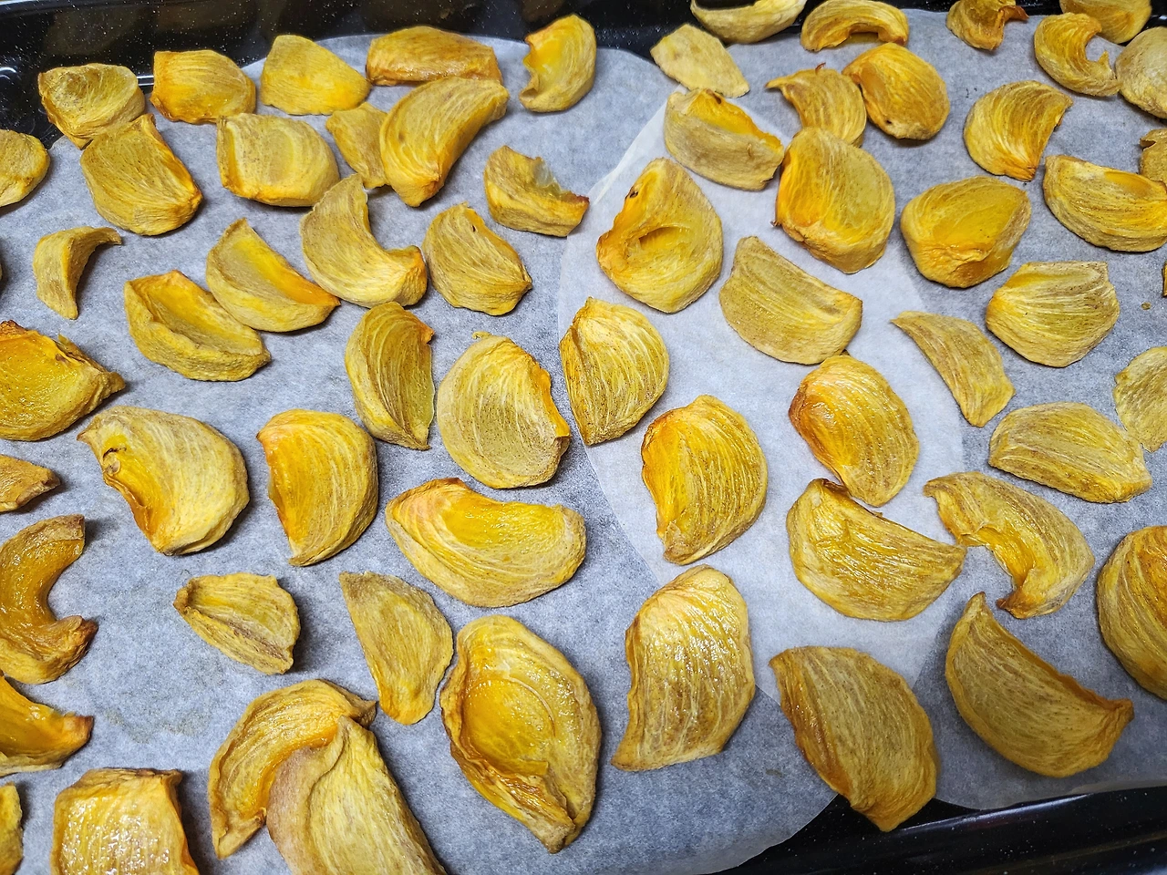 깎아놓고 보니 두 번은 해야 할 것 같다. 두 번을 해야 하니 시간이 짧게 걸리는 레시피를 선택했다. 오븐에 180도로 30분 돌리고 뒤집어서 40분을 추가로 돌린다. 나름 감말랭이의 모양은 갖췄지만 안이 서걱거린다. 더 돌리면 겉이 탈 것 같고, 마음이 급해 다음 판을 만든다. 다음 판을 돌리는 동안 첫 판에서 나온 감말랭이를 실온에 둔다. 잠시 두니 감말랭이에 촉촉하게 당분이 올라온다. 고개를 갸웃거리며 만든 감말랭이는 서걱거리지만 못 먹을 정도는 아니다. 다음에는 시간이 오래 걸리더라도 저온에서 오래도록 건조해야겠다. 썩혀서 버리는 것보다 낫다고 스스로를 위로한다.