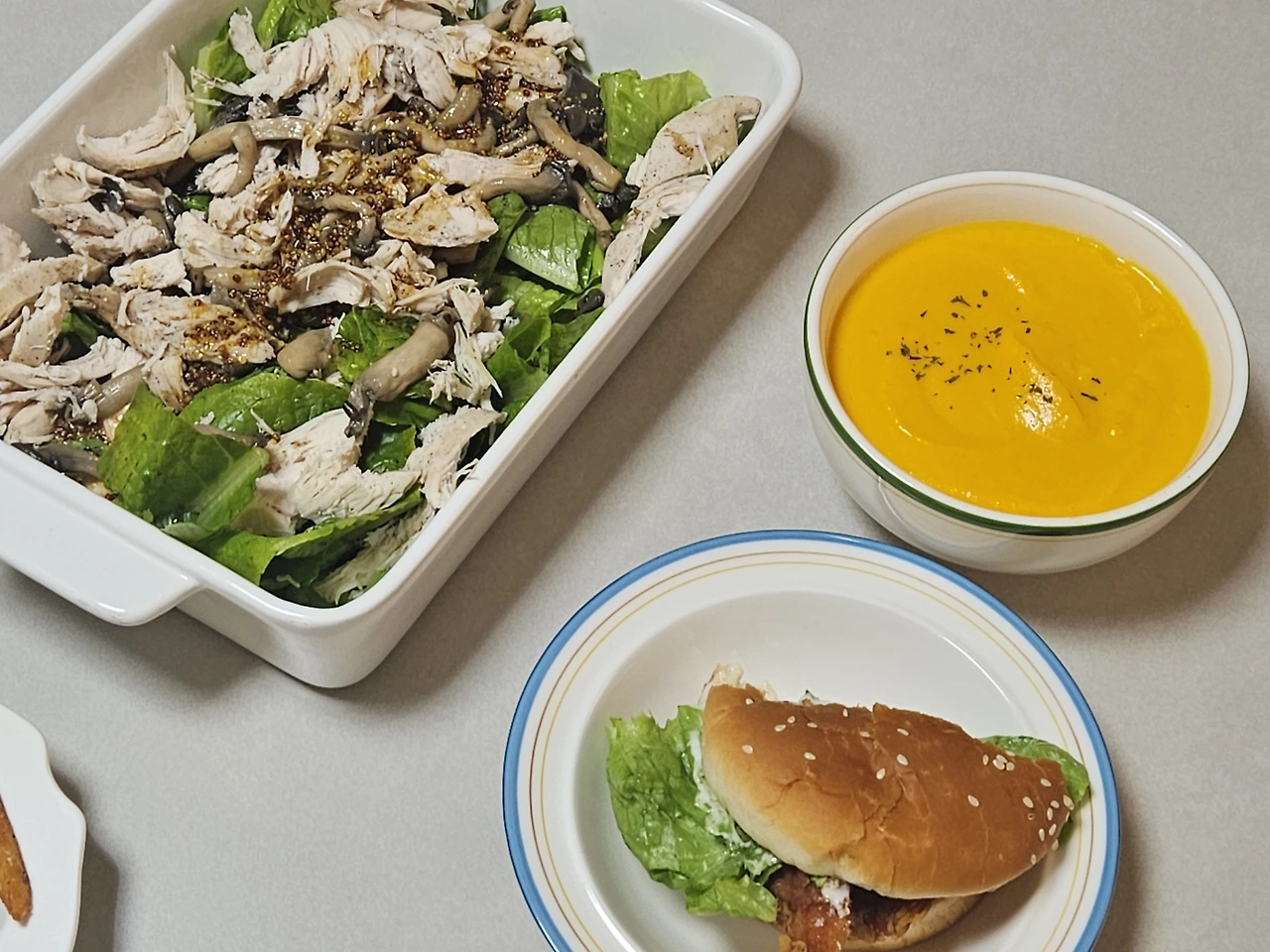 퇴근할 무렵 직장에서 맘스터치 버거를 받았다. 남편이 좋아하는 케이준 감자튀김도 챙겼다. 원래 같으면 하나로 못 나눠 먹겠지만 나도 양이 줄었고 남편도 다이어트를 하니까 다른 음식을 곁들여 버거 하나를 나눠 먹을 수 있다. 곁들일 음식을 생각하다가 당근 수프와 버섯 샐러드를 만들었다.