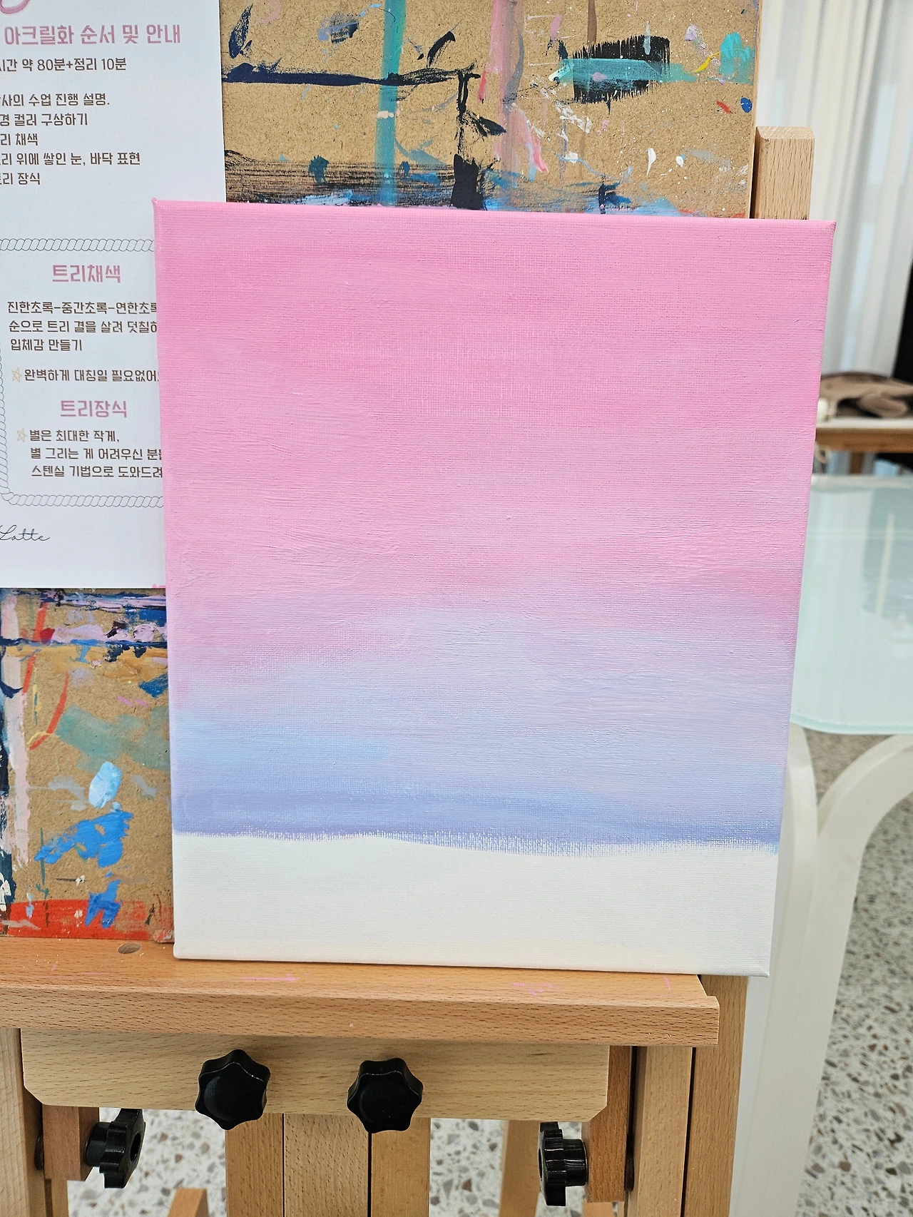 수업 시작 시간이 되자, 친구처럼 친근한 선생님은 배경 색부터 정하라고 하셨다. 원하는 색을 이야기하면 바로 물감부터 짜주시고, 특별한 설명 없이 바로 시작이었다. '어떤 색 배경을 칠할까?' 잠깐 고민 후, 바로 고른 색 '핑크'!