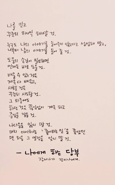내가 좋아하는 게 뭔지, 내가 잘하는 게 뭔지, 나만의 장점이 뭔지, 나이가 들었을 때도 하고 싶은 게 뭔지, 하나하나 적어 갔다. 앞으로 어떻게 살고 싶은지, 어떤 삶이 바람직하다고 생각하는지 고민했다. 그동안 눈앞에 닥친 문제들을 처리하듯 삶을 살아내느라 정신이 없었다면, 이제야 잠시 숨을 고르고 '생각'이라는 걸 했다.