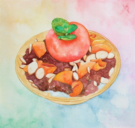 나무쟁반에 담겨 나온 홍시 빙수는 고급스러운 유기그릇의 황금빛과 어우러져 반짝거리며 고운 자태로 꼬리 아홉 달린 여우처럼 사람을 홀리기 시작했어요. 홍시 위에 살포시 얹어진 애플민트 이파리는 초여름의 연둣빛 풋사과처럼 상큼해 보였고, 껍질을 벗긴 홍시의 주황색 속살은 어서 한입 먹지 않으면 난리가 날 것처럼 저를 애태우며 유혹했습니다. 소녀의 볼처럼 빨간 홍시 아래 듬뿍 얹어진 다갈색 팥과 썰은 곶감, 그리고 슬라이스 된 아몬드의 향연이란...!