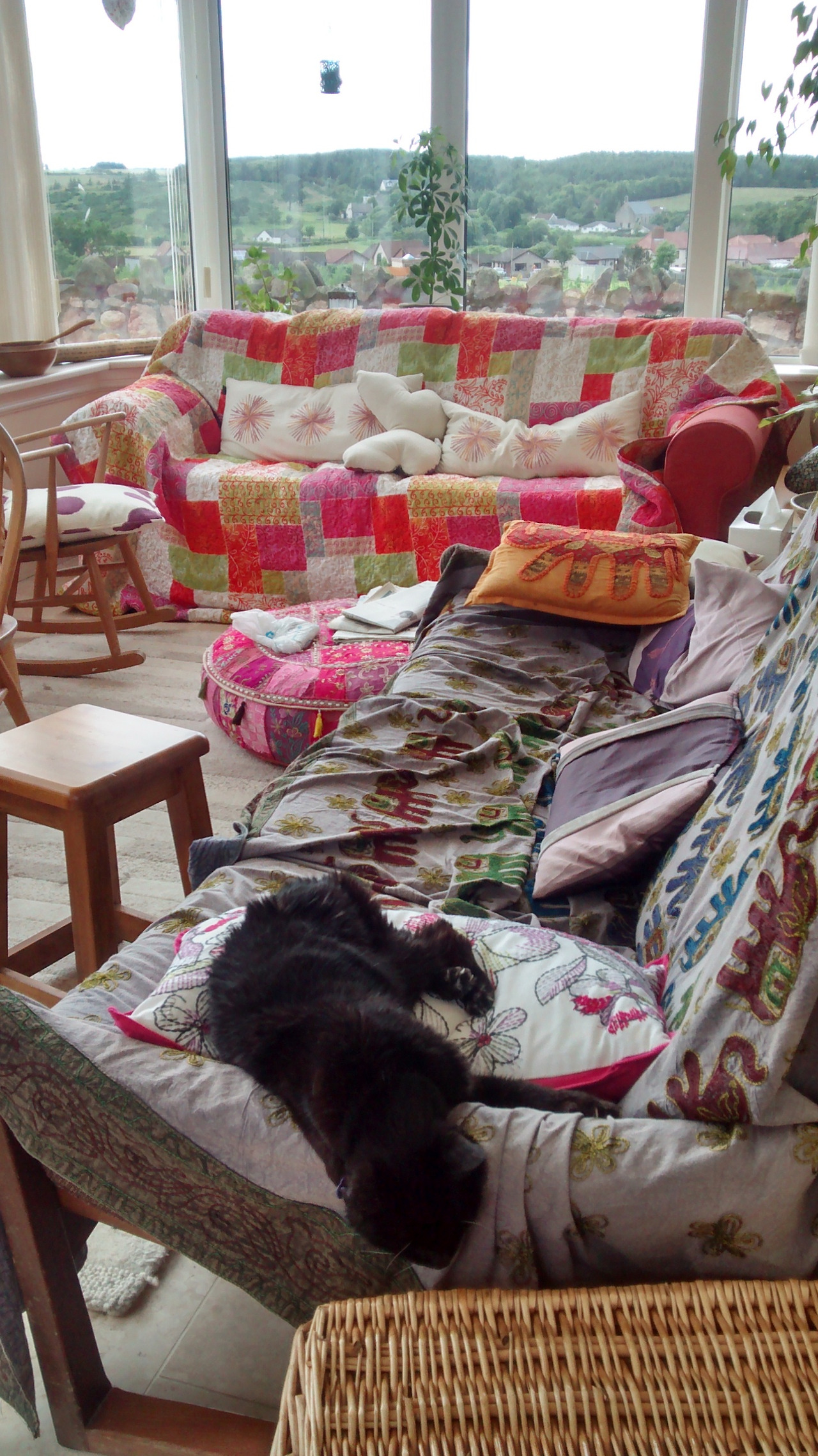 통유리창으로 아름다운 풍경이 보이는 제니의 썬룸에서 휴식을 취하고 있는 버니. 오래전에 무지개다리를 건넜다.