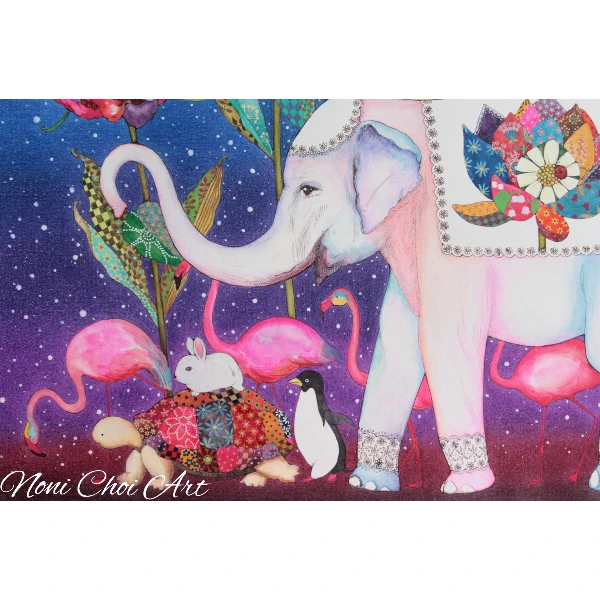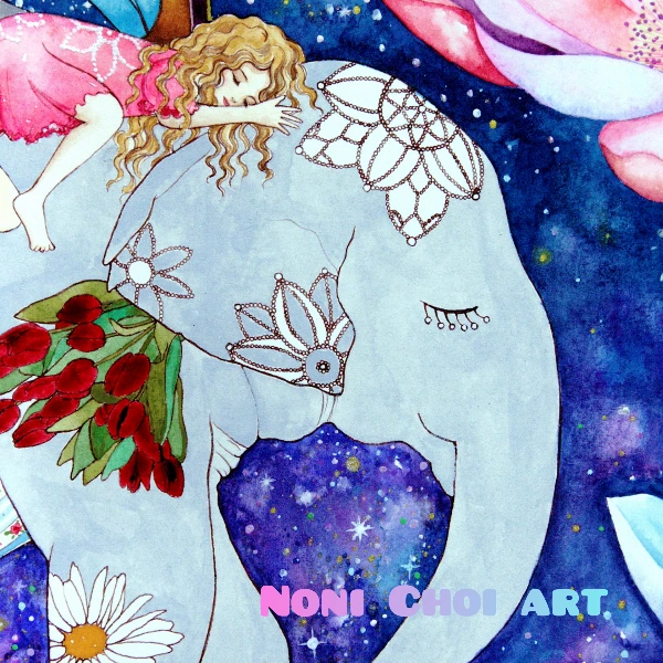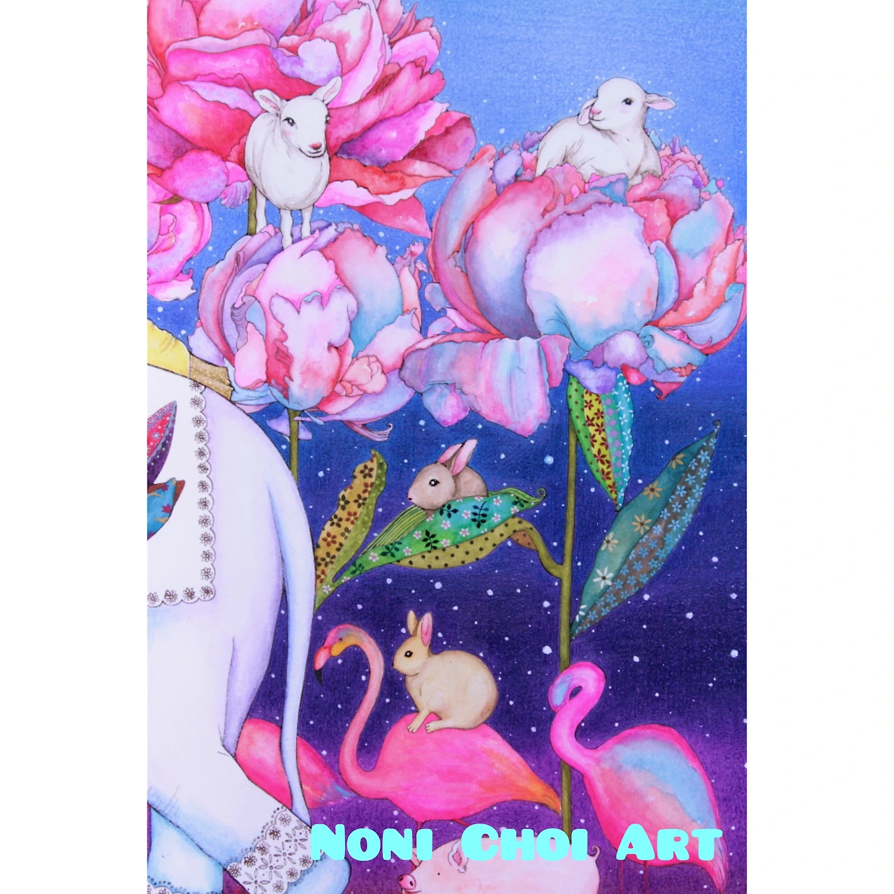 종이 위에 혼합재료. 노니 그림 2021. 그동안 먹은 돼지에게 미안해서 돼지그림도 그려넣은 작품