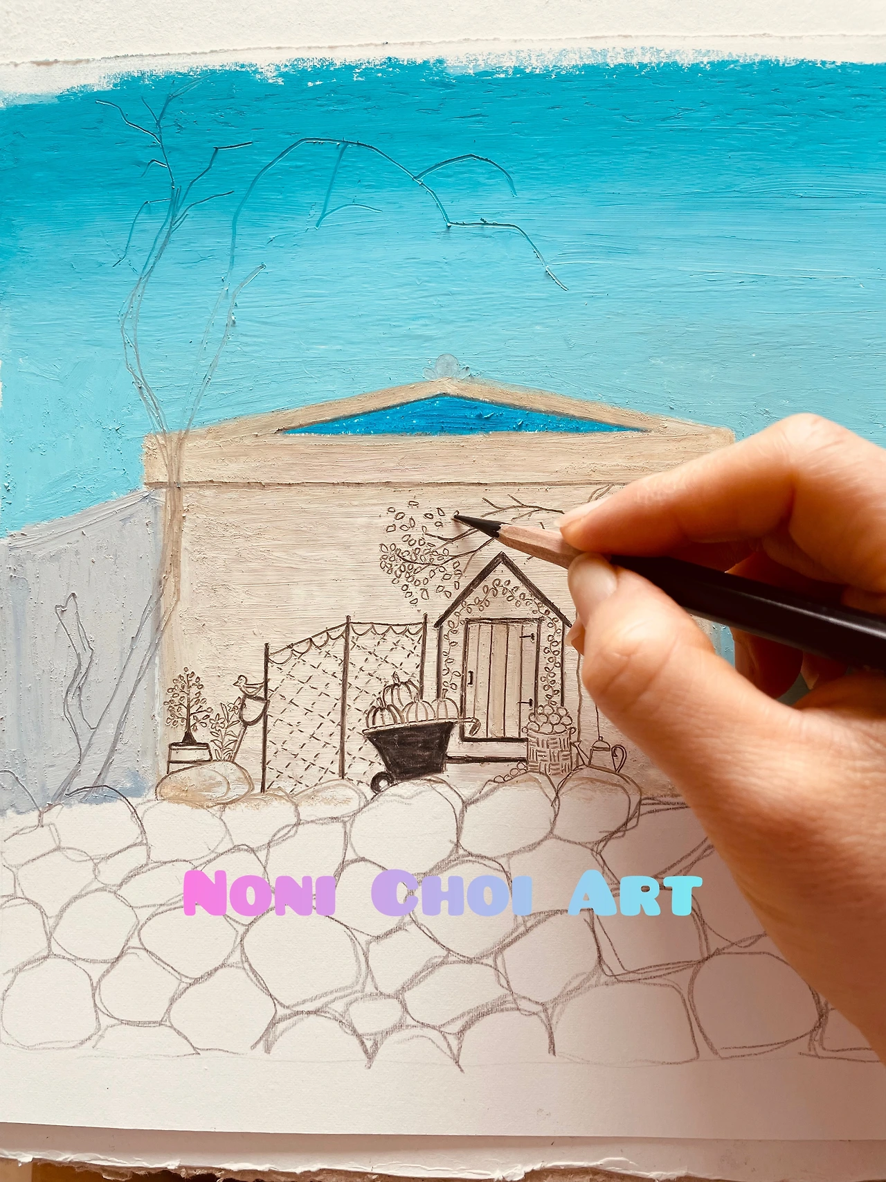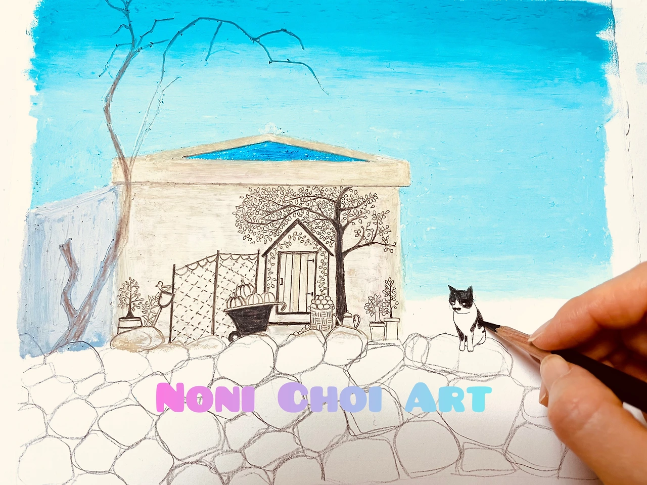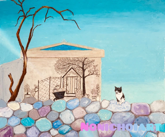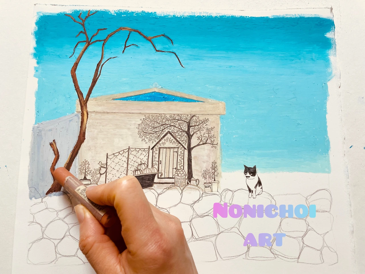 마법의 산책시간 그리고 오일파스텔과 색연필로 그린 제주도 고양이 그림
