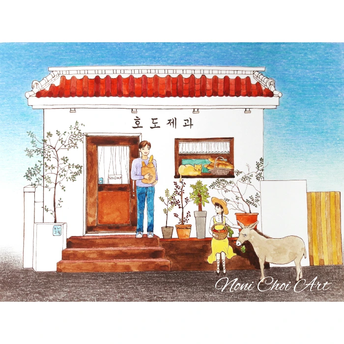 노란 고양이가 식빵 굽는 빵집을 그려봤어요.