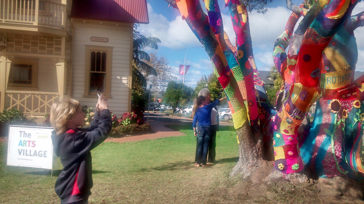 로토루아 아트빌리지 앞에 자리한 나무에 손뜨개로 옷을 입힌 로토루아 주민들. 여긴 모두가 아티스트예요!