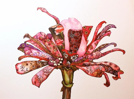 잉크로 밑그림을 그린 꽃 위에 붉은 계열 색 수채물감으로 채색하여 완성했습니다.
