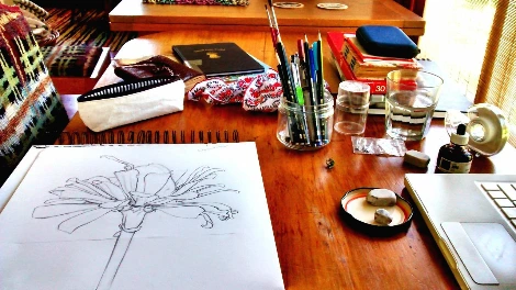 브리짓의 집에서 하우스시팅하며 그리던 그림입니다. 연필로 먼저 스케치하고 심혈을 기울여 잉크로 펜드로잉한 백일홍