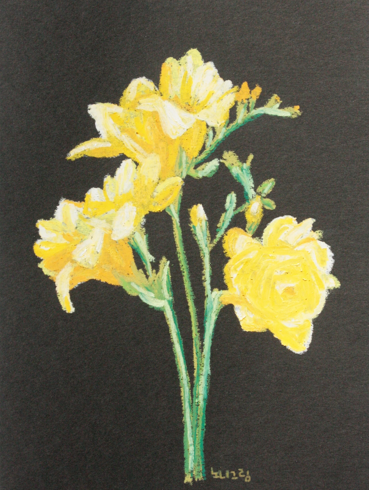 꽃집에서 노란 프리지아 한 다발을 사서 버스에 올랐어요.