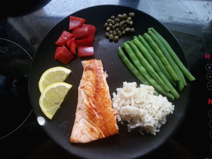 할아버지께 만들어 드린 점심. 연어, 밥, 콩, 케이퍼, 파프리카