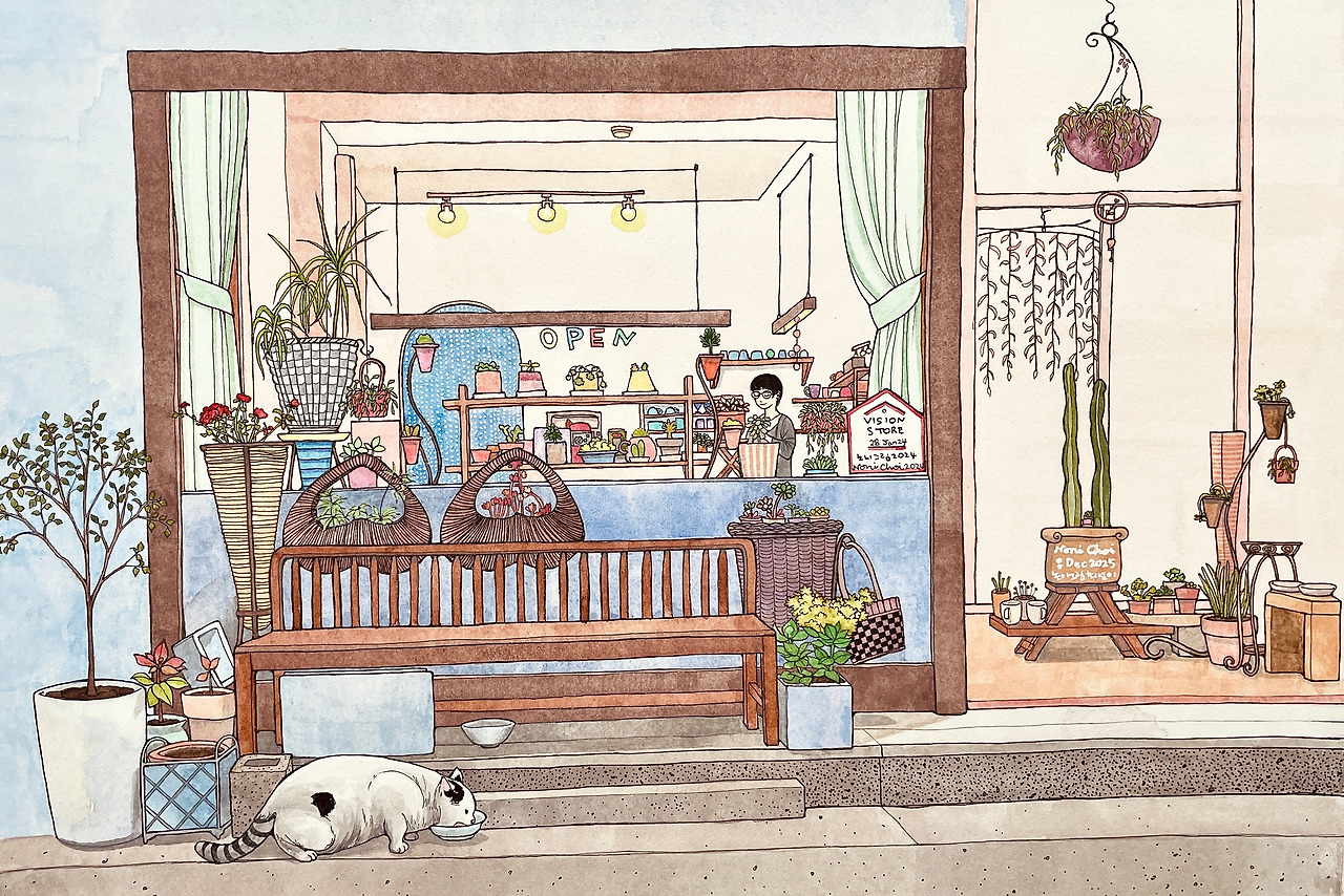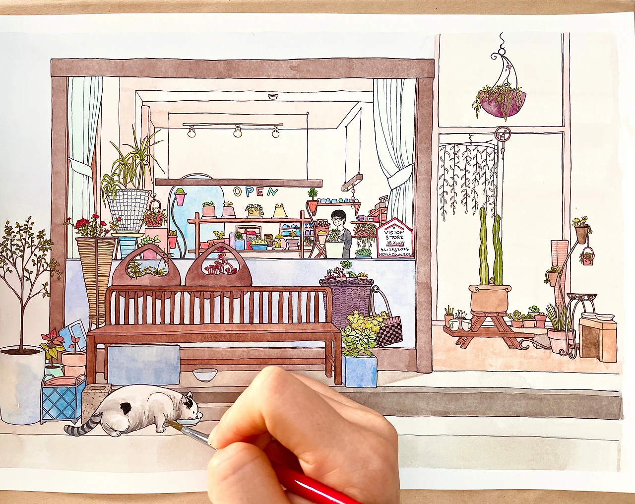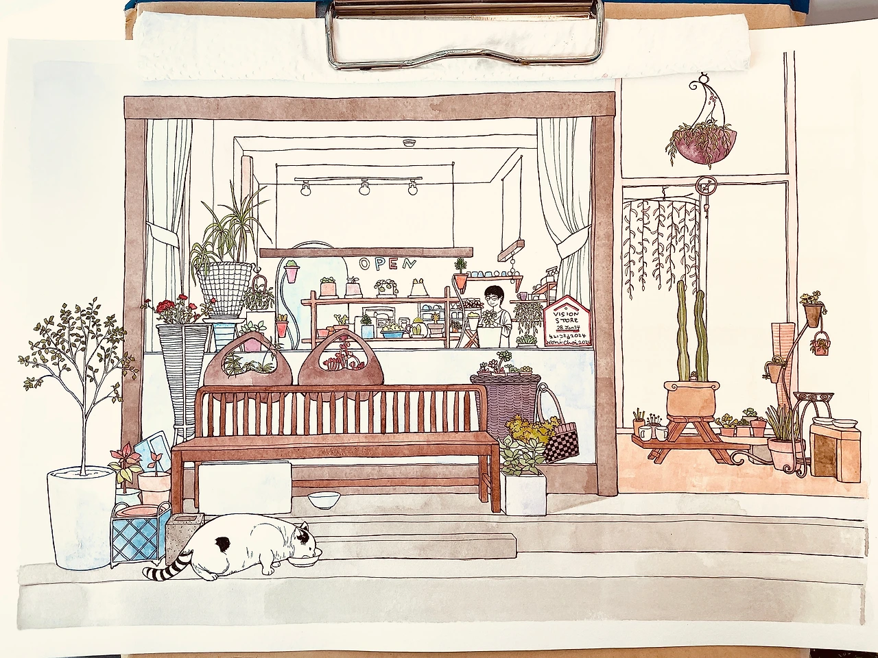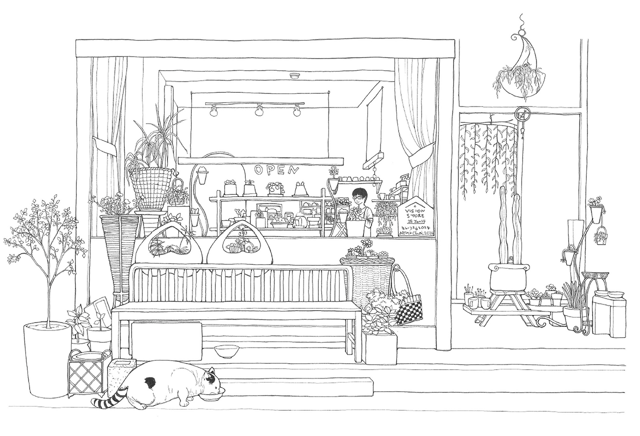 환히 불이 켜진 가게 내부엔 사장님으로 보이는 분이 뭔가에 열중한 모습으로 서계셨어요. 아무것도 바라는 마음 없이 작은 생명에게 양식을 기꺼이 내주신 마음씨 고운 사장님과 밥그릇에 그 작은 분홍색 코를 박고 열심히 밥을 먹던 고양이의 모습을 식물의 생기가 넘쳐흐르는 아름다운 가게와 함께 사진 속에 담아본 뒤 1년이 지나 그림으로 그려보려 펜을 들었습니다. 작은 인테리어 소품과 화분이 많아 그리면서 인내심을 발휘해야 하는 순간이 다가오기도 했지만 이렇게 기분 좋게 그림을 그린적이 오랜만이라 기분이 좋았어요. 서로 교감을 하고 있는 아름다운 두 생명체가 그림 속 주인공이라서 그런 걸까요? 따뜻한 정을 나누고 있는 모델들이 그림 속에 숨 쉬고 있어서 더욱 정겹습니다.