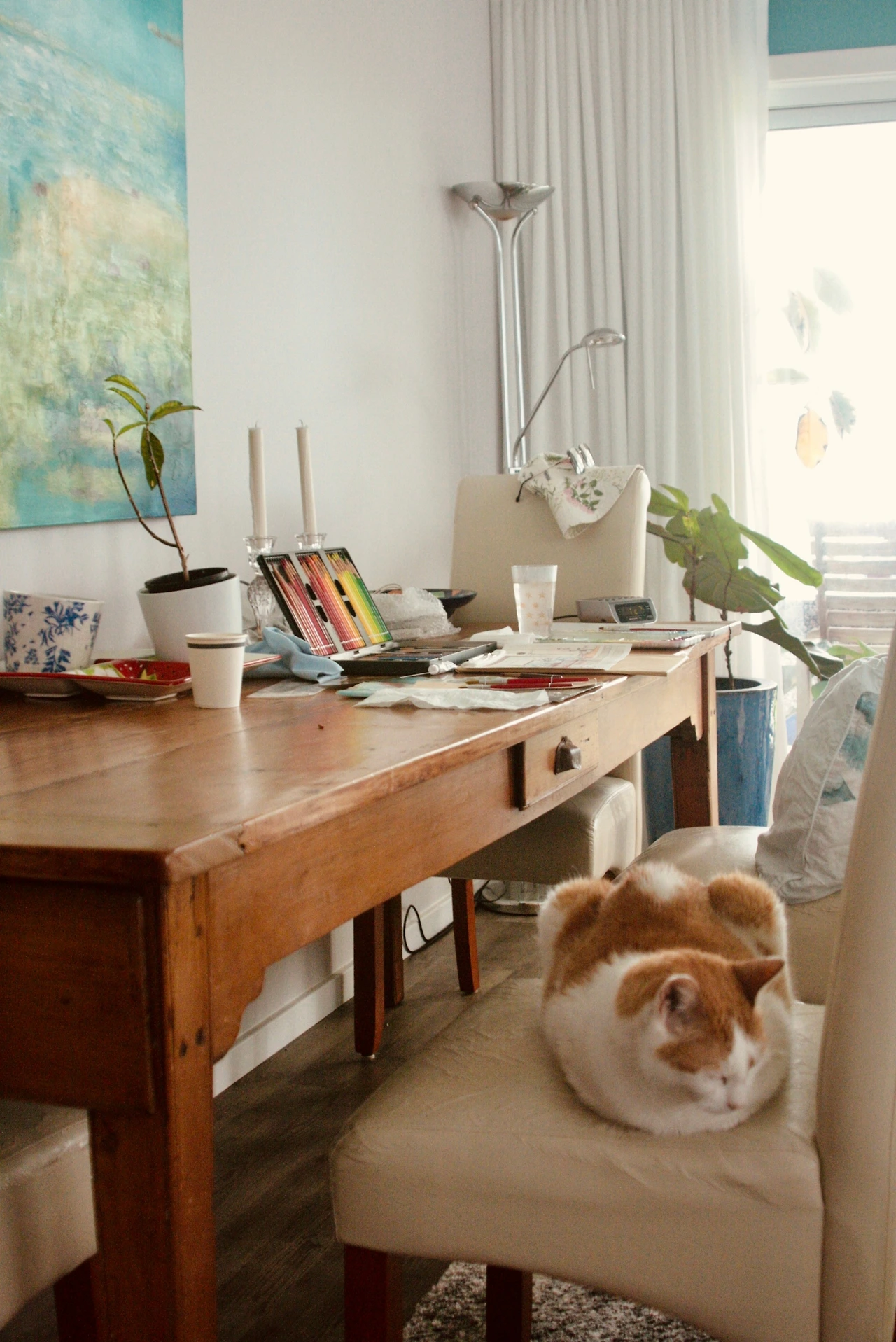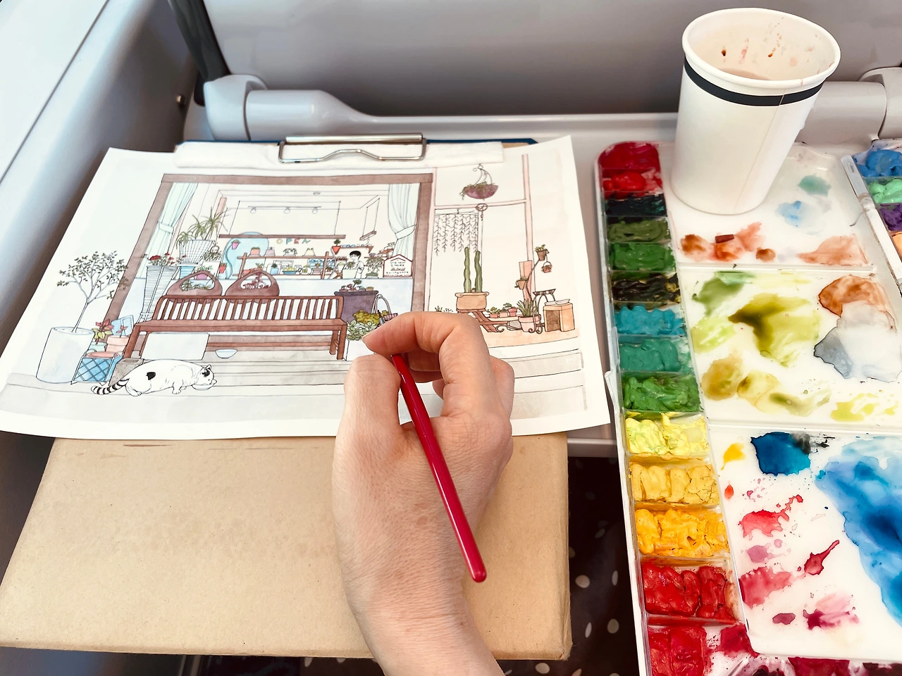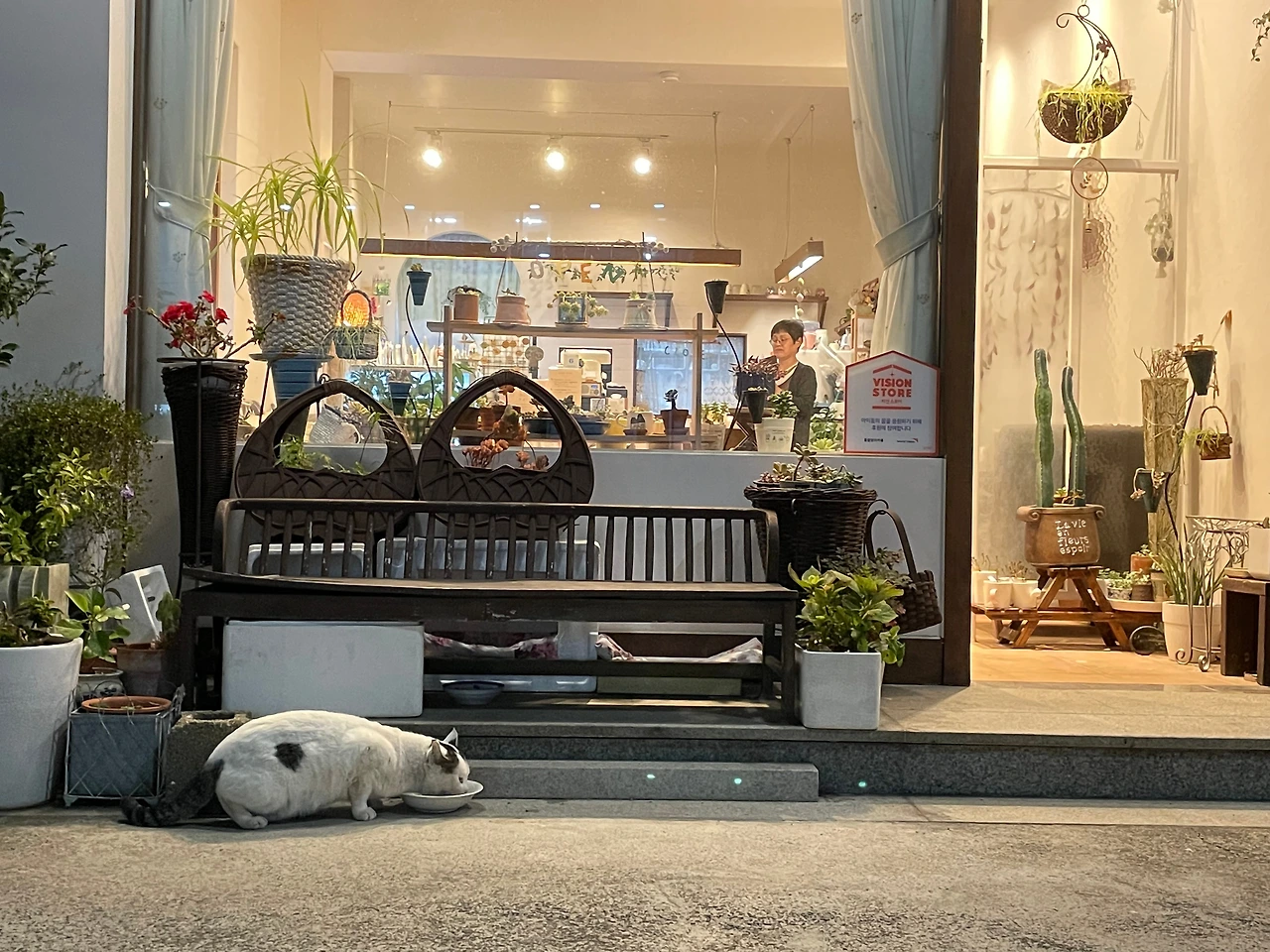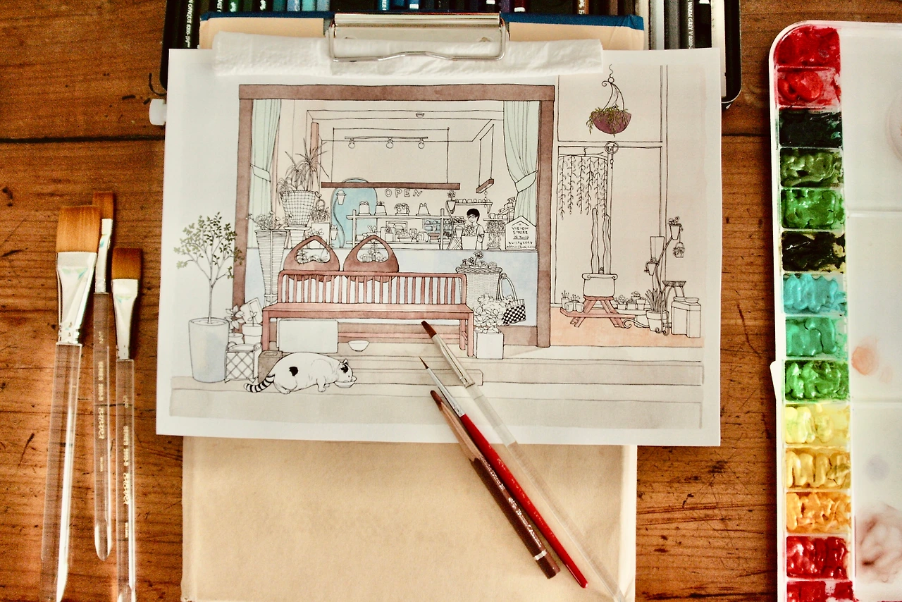 환히 불이 켜진 가게 내부엔 사장님으로 보이는 분이 뭔가에 열중한 모습으로 서계셨어요. 아무것도 바라는 마음 없이 작은 생명에게 양식을 기꺼이 내주신 마음씨 고운 사장님과 밥그릇에 그 작은 분홍색 코를 박고 열심히 밥을 먹던 고양이의 모습을 식물의 생기가 넘쳐흐르는 아름다운 가게와 함께 사진 속에 담아본 뒤 1년이 지나 그림으로 그려보려 펜을 들었습니다. 작은 인테리어 소품과 화분이 많아 그리면서 인내심을 발휘해야 하는 순간이 다가오기도 했지만 이렇게 기분 좋게 그림을 그린적이 오랜만이라 기분이 좋았어요. 서로 교감을 하고 있는 아름다운 두 생명체가 그림 속 주인공이라서 그런 걸까요? 따뜻한 정을 나누고 있는 모델들이 그림 속에 숨 쉬고 있어서 더욱 정겹습니다.