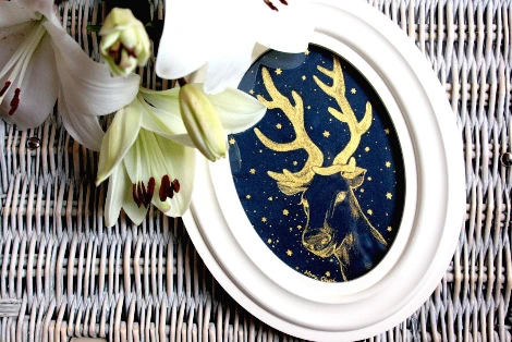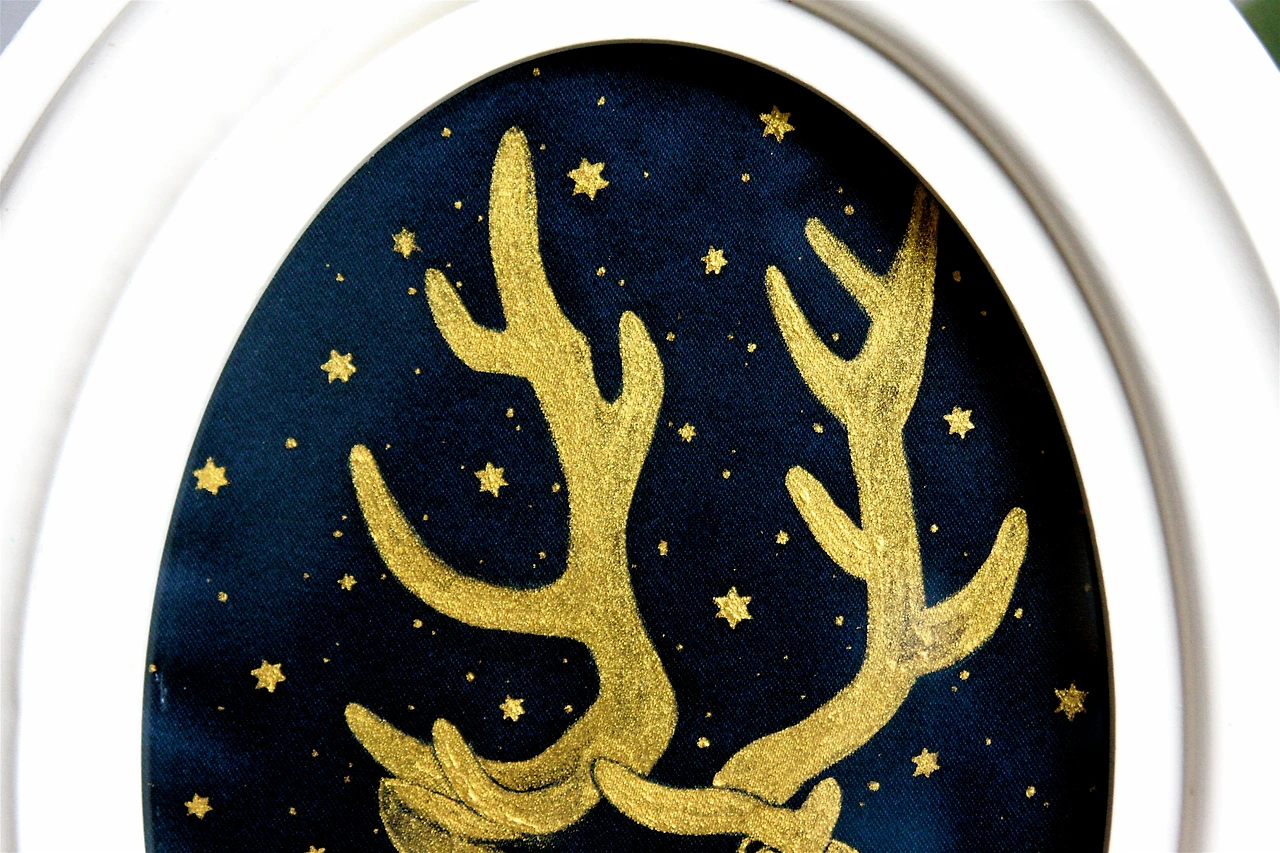 공단위에 금분가루와 아교를 섞어 붓으로 그린 사슴.