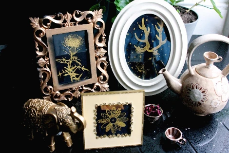 녹용으로 먹어 미안해서 그린 사슴뿔 그림과 금분으로 그린 엉겅퀴, 데이지, 직접 만든 도자기 주전자와 미니 찻잔.