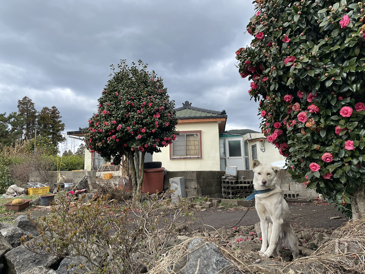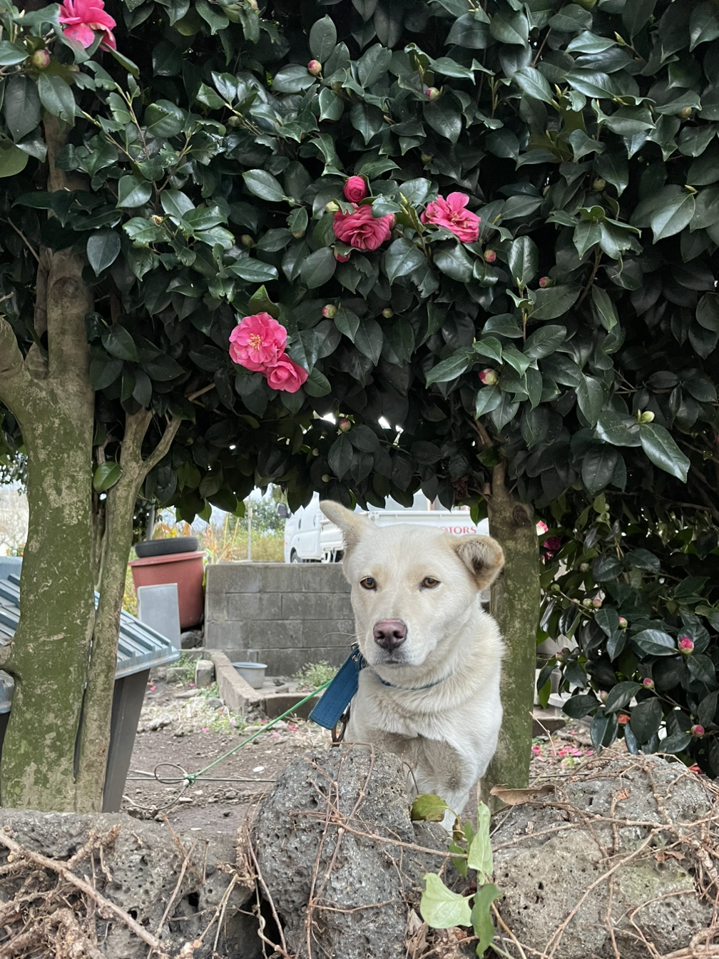 흐드러지게 핀 강렬한 분홍색 동백꽃을 배경으로 하얀 짓돗개가 머리를 돌담 위로 빼꼼 내놓은 모습은 마치 흩날리는 꽃배경 속 순정만화 주인공처럼 예뻐서 함박웃음이 절로 지어졌답니다.