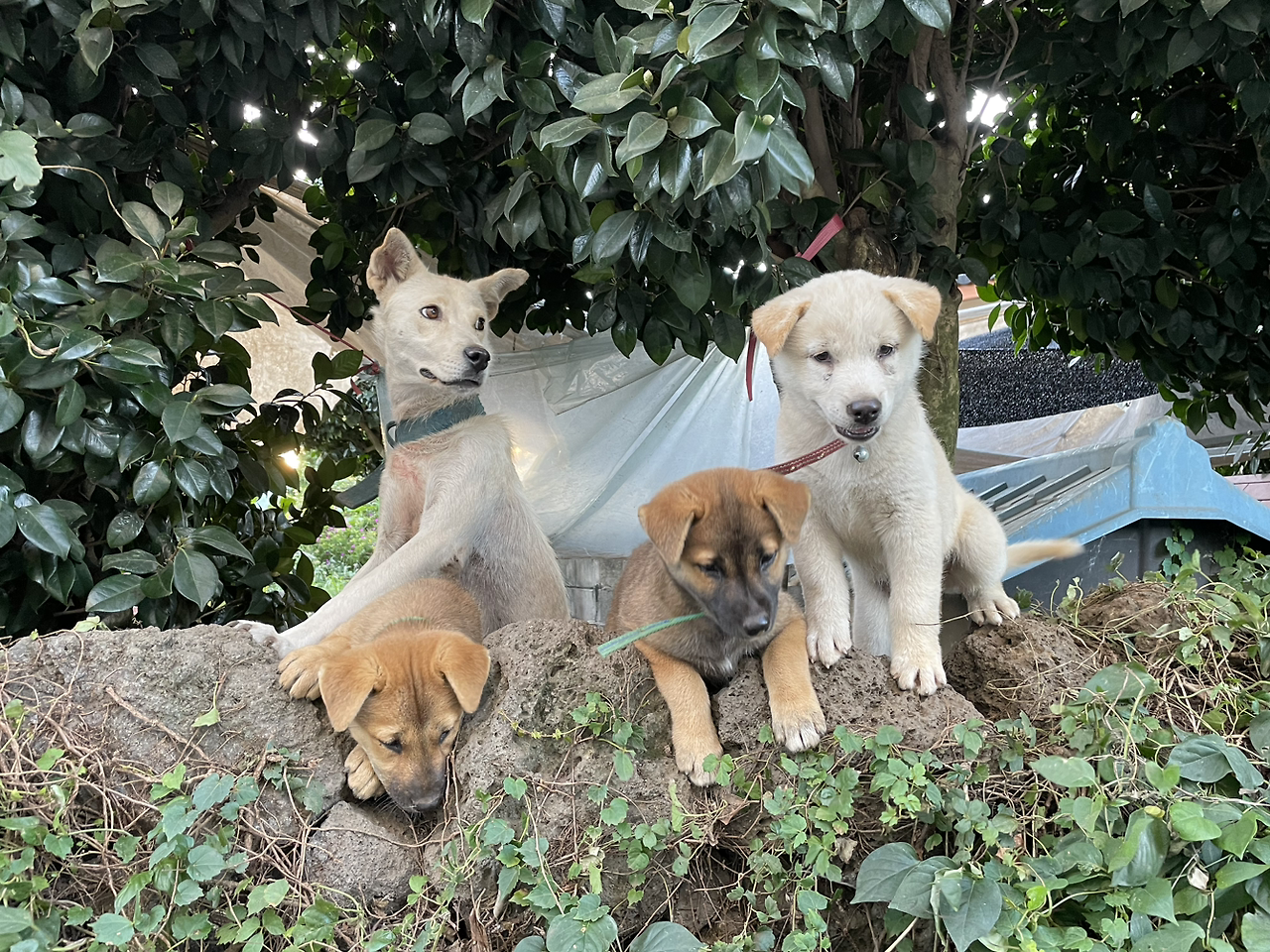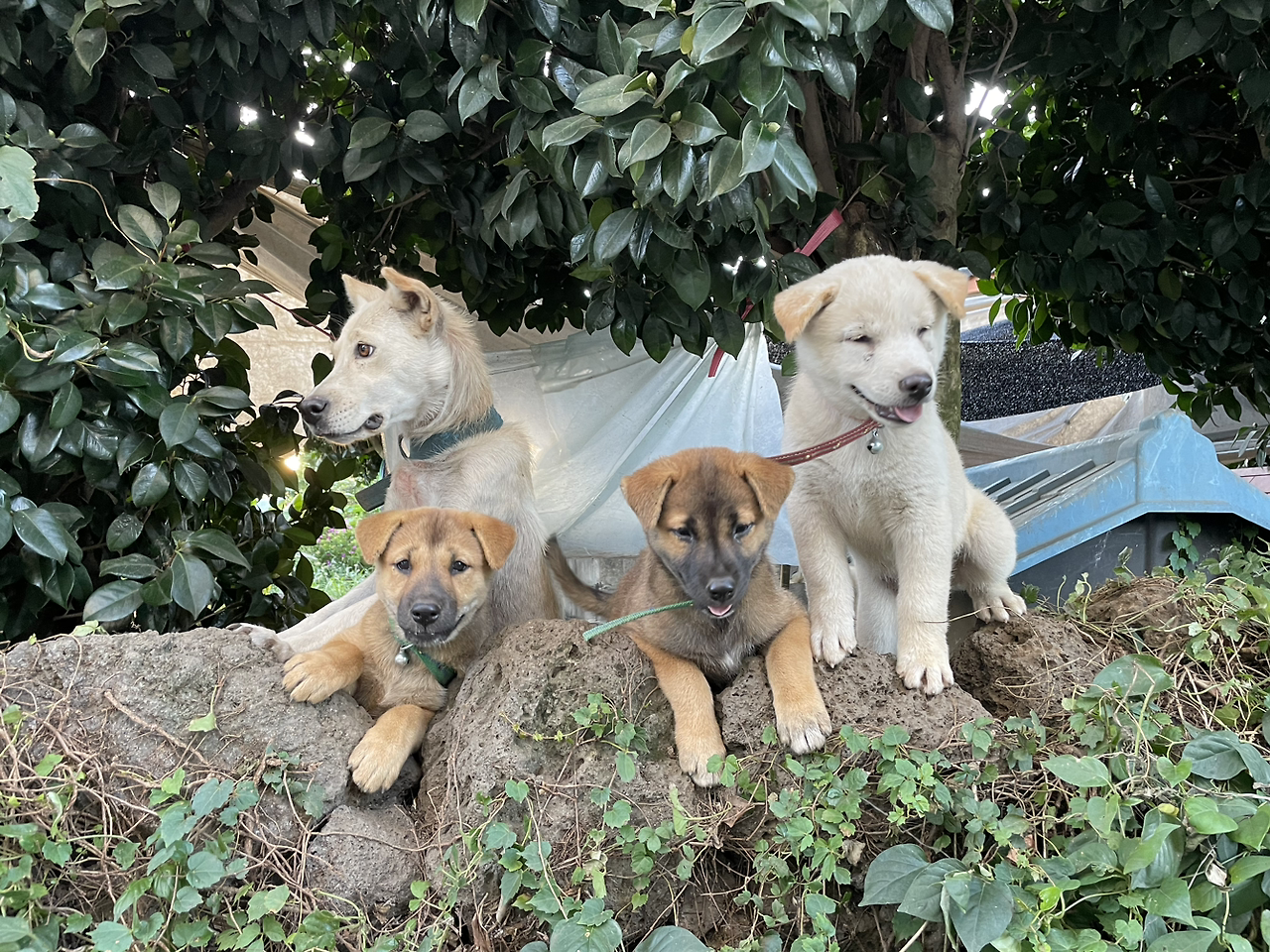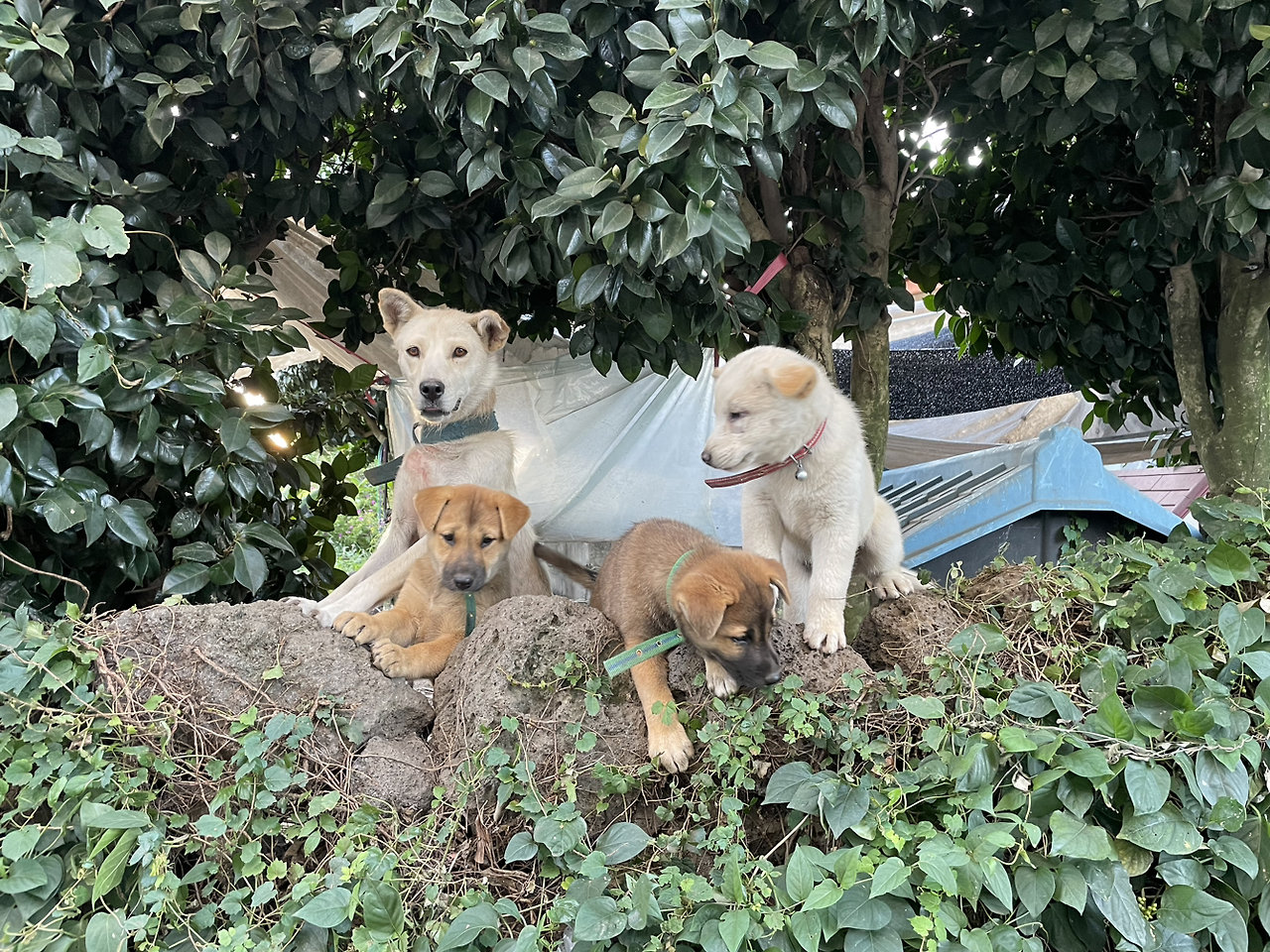 백구의 아가들이 태어난 것이었습니다. 2~3개월쯤 되어 보이는 귀여운 삼둥이들은 아기 황구 둘에 아기 백구 하나로 너무나 귀여웠어요. 돌담 위로 난리를 치며 나타난 아가들 뒤로 엄마가 된 백구가 모습을 드러냈는데 안 본 사이 백구는 할머니가 되어 폭삭 늙어있었어요. 육아에 지치고, 9월 중순까지 35도를 기록한 제주의 이상 고온현상에 볼이 쏙 들어간 몹시도 초췌해진 몰골이었죠. 한여름에 몸을 풀고 산모가 땡볕에 얼마나 개고생을 했으면 저리도 비쩍 말랐나 마음이 아파왔어요.