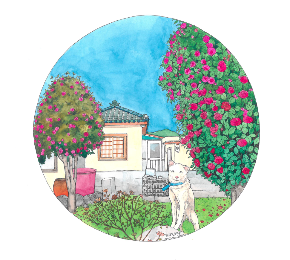 재작년 이른 봄, 백구를 처음 본 날은 마치 아름다운 영화의 한 장면이나 한 폭의 그림 같은 기억으로 남아있어요. 차가 다니는 큰길에서 왼쪽으로 꺾어져 좁다랗고 휘어진 골목으로 들어오면 담쟁이덩굴과 어우러진 돌담이 낭만적으로 쌓여있는 집에 동백나무 몇 그루가 심어져 있고, 바로 그 나무 밑에 돌담을 등지고 파란색 지붕의 개집이 놓여 있습니다. 백구는 골목에서 인기척이 느껴지자 무료함을 달래려는지 컹컹 짖으며 돌담 위로 순식간에 모습을 드러내고 적의 없는 순수한 시선으로 사람 구경을 하기 시작했어요.