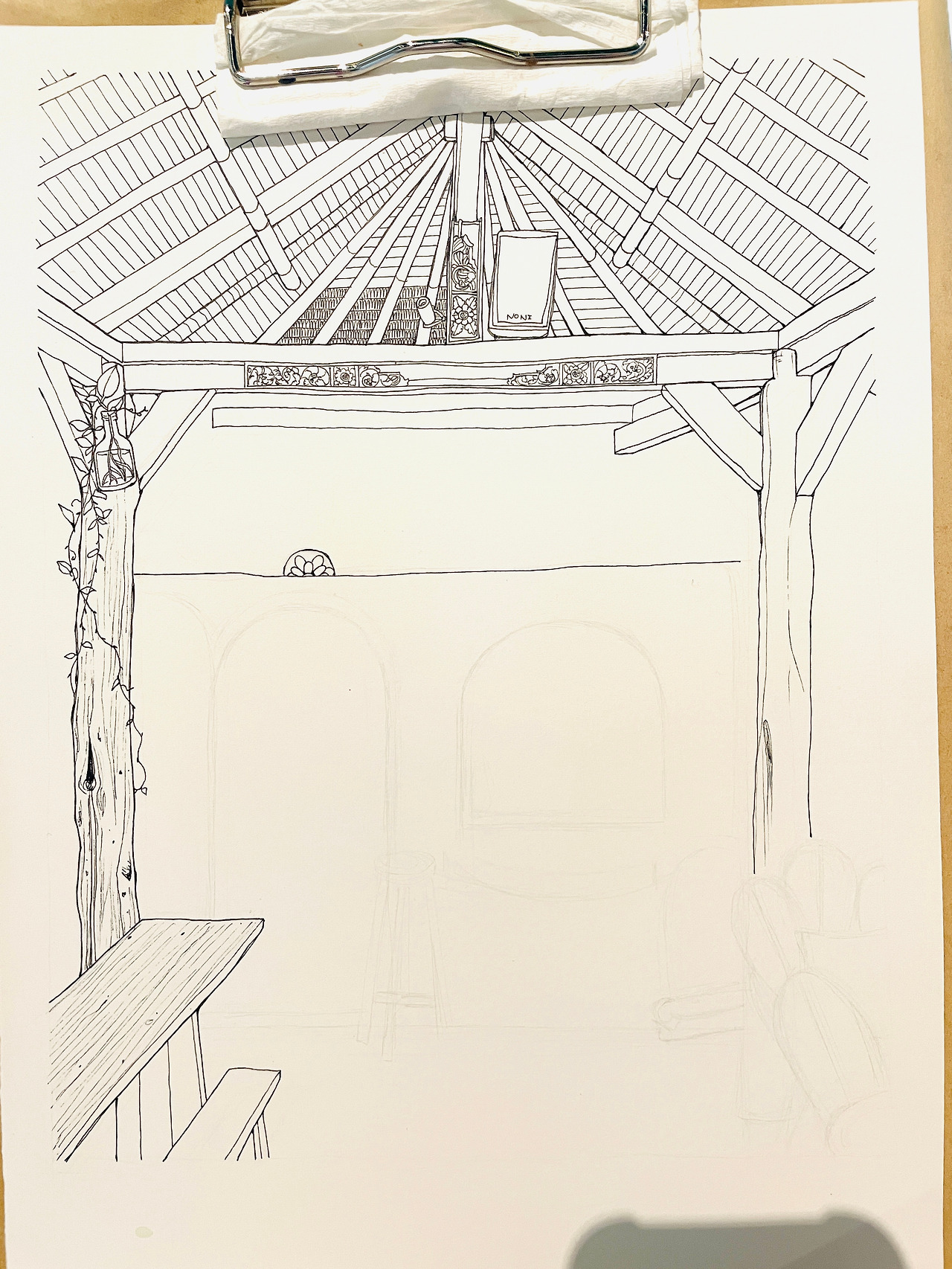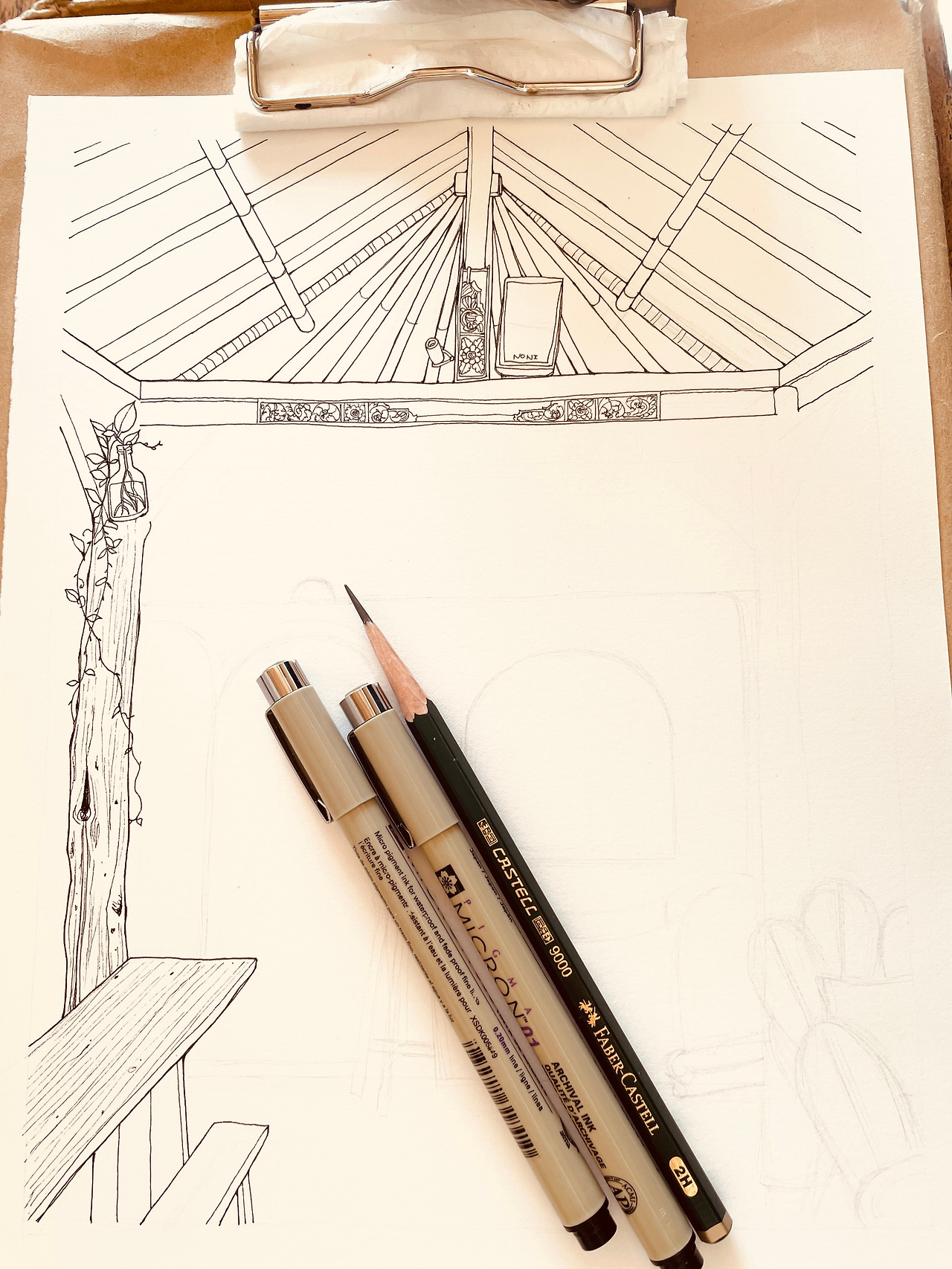 이 예쁜 맛집 Yellow Flower Cafe를 그림으로 그리기 시작했어요. 우선 연필(2H 같이 연한 심의 연필)로 중요한 선을 대충 그어준 뒤 피그마 마이크론펜(방수펜)으로 밑그림을 그려줍니다.