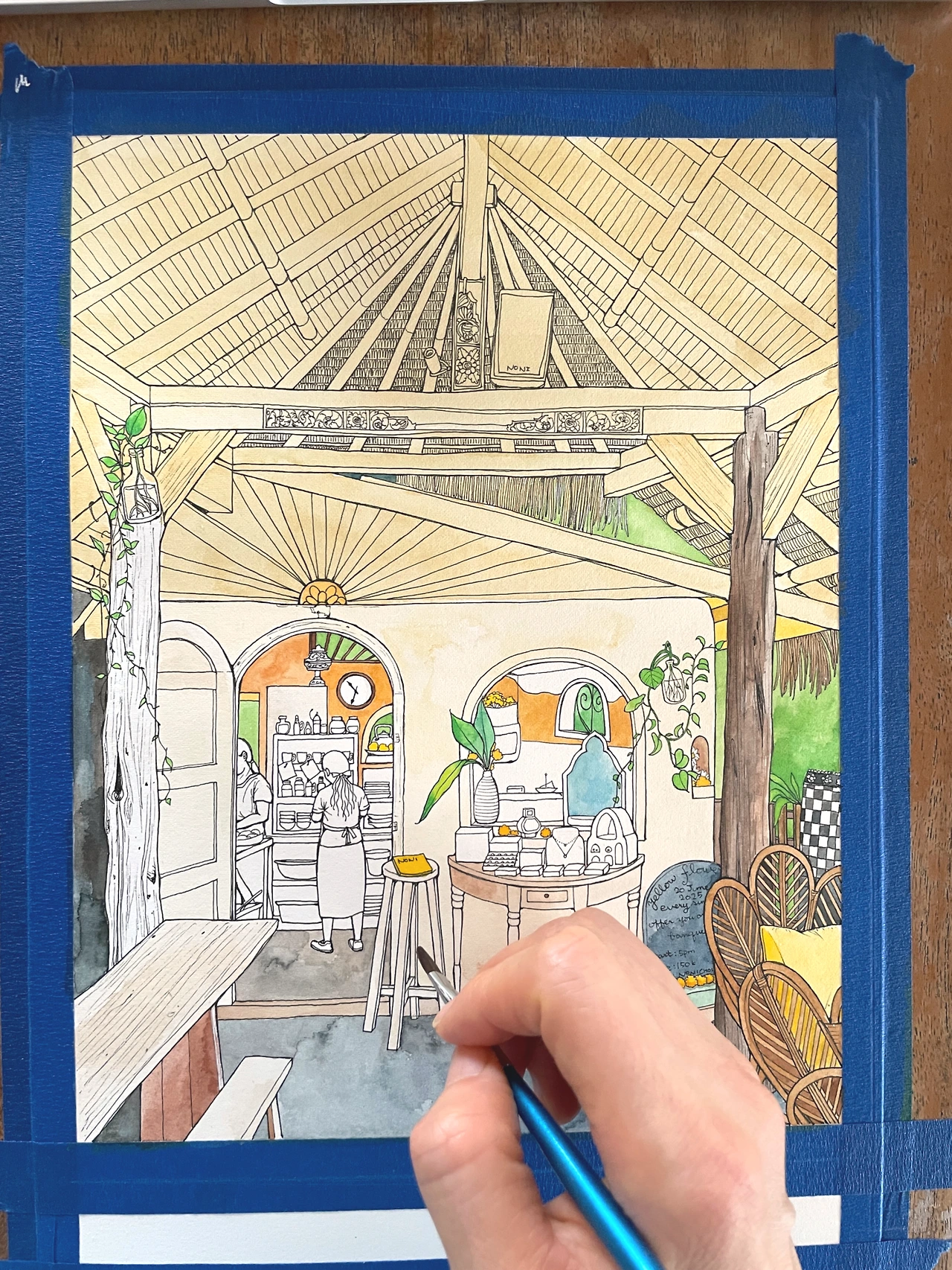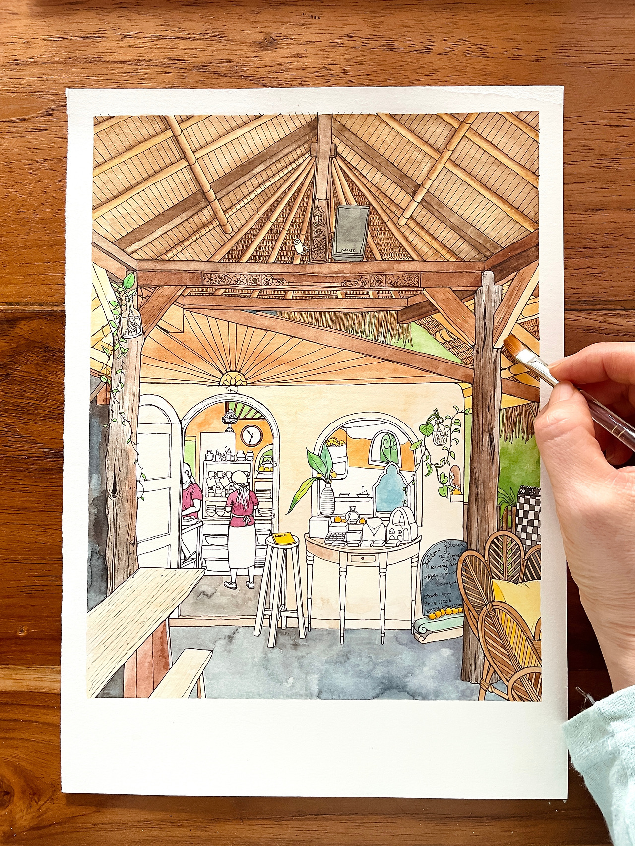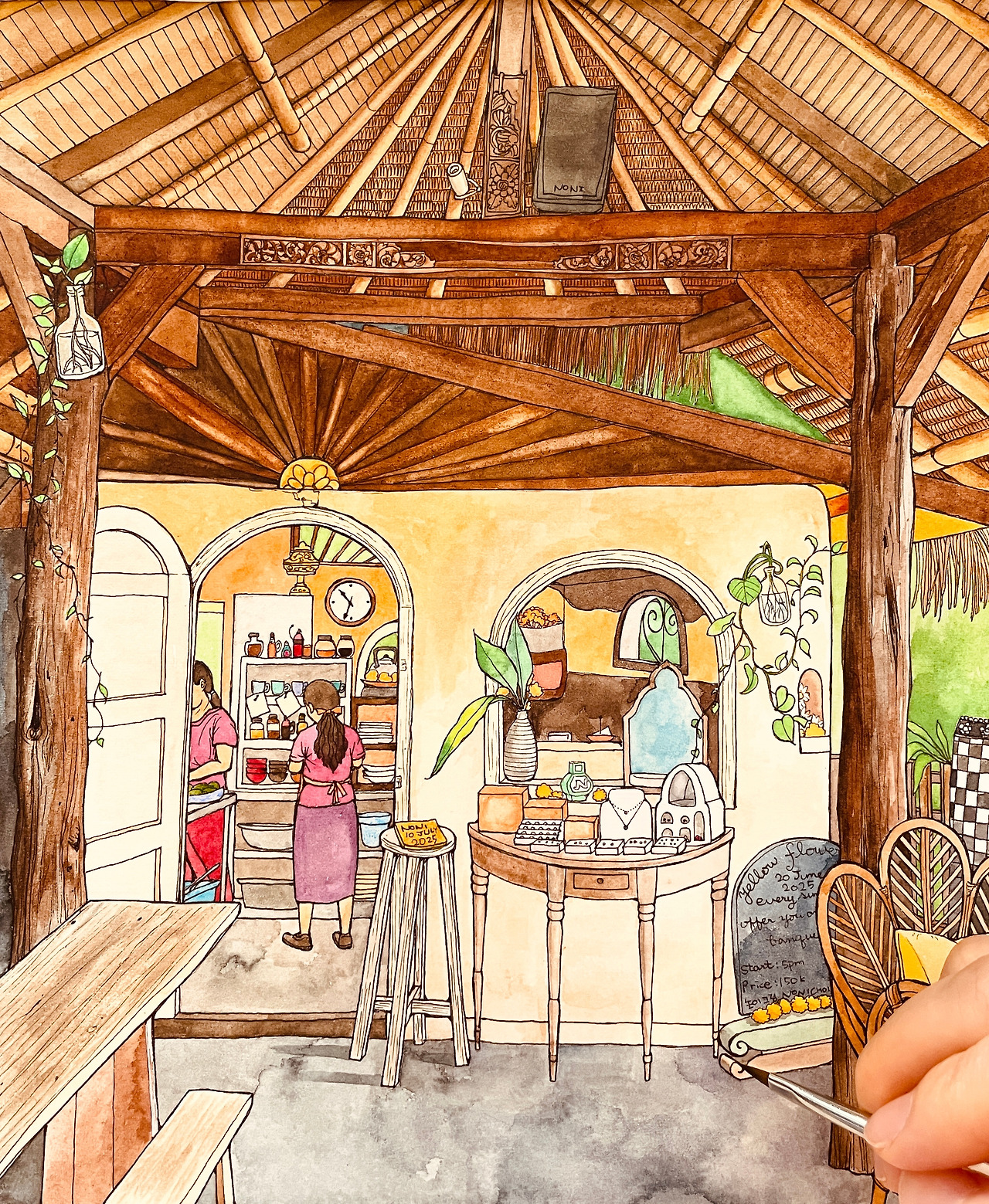 예술적인 발리식 천장을 붓으로 채색하기가 가장 힘들었지만 마치고 나니 뿌듯해졌습니다.