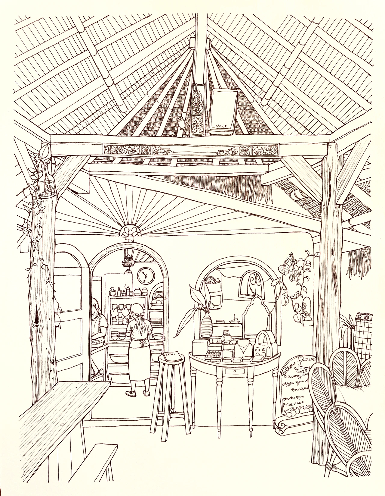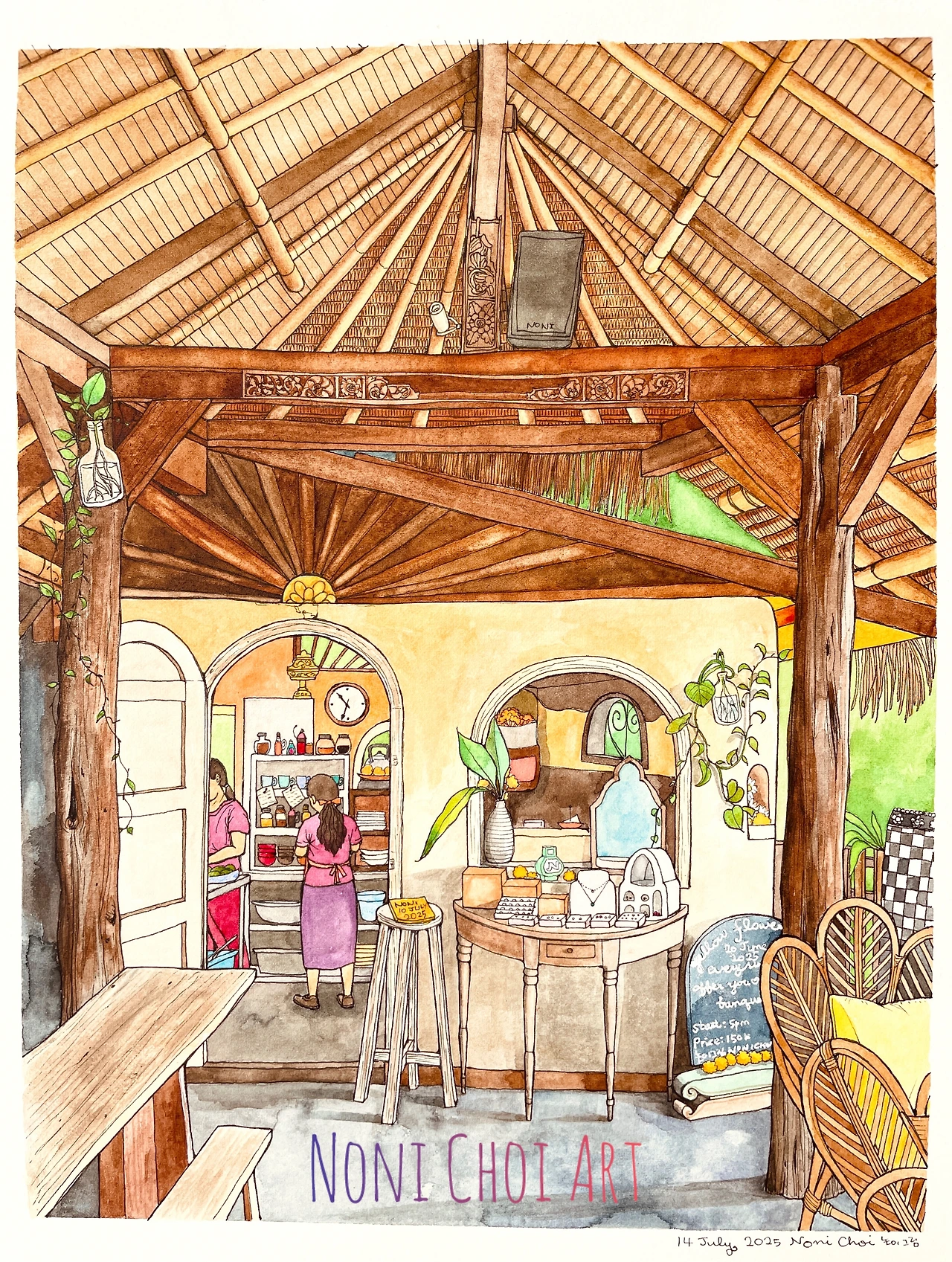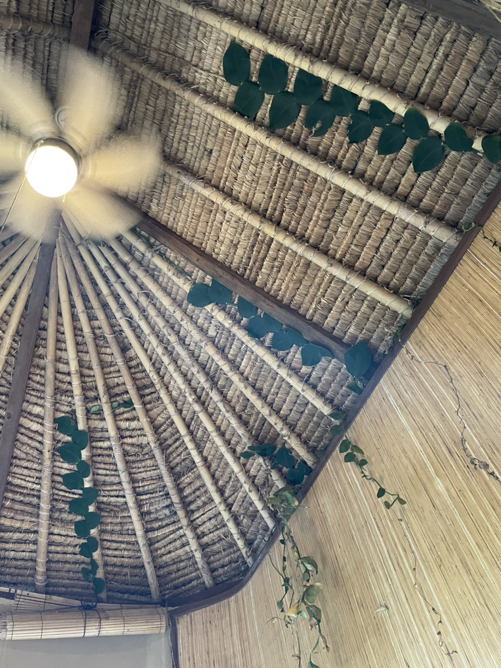 예술적인 발리식 천장을 붓으로 채색하기가 가장 힘들었지만 마치고 나니 뿌듯해졌습니다.