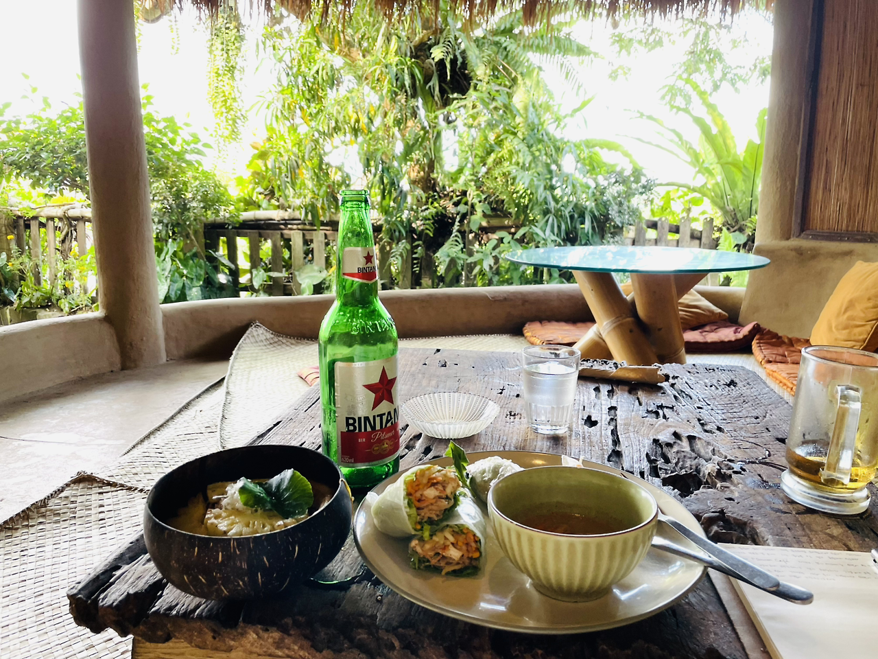 초가집같이 생긴 정자에 신발 벗고 들어가 앉아 부채질로 땀을 식혔어요. 큰 빈땅맥주 한 병, 채식옵션 나시고랭, 스프링롤을 시키고 잠시 기다린 후 음식이 나와 한입 먹어보니 오후의 나른함과 더위에 반쯤 잠겨있던 눈이 번쩍 뜨였어요. 어떻게 이런 맛이!? 까만 나무볼에 담겨 파인애플과 바나나가 얹어 나온 나시고랭은 열대과일 덕분에 달달함이 더해져 계란과 함께 나왔을 때보다 한결 감칠맛이 났고 땅콩소스에 찍어먹는 스프링롤은 고소하고 신선한 맛이 좋았어요. 땅콩을 즐겨 먹지 않아 땅콩소스나 피넛버터를 멀리하는 제가 소스 바닥까지 싹싹 긁어먹어보기는 처음이었어요.