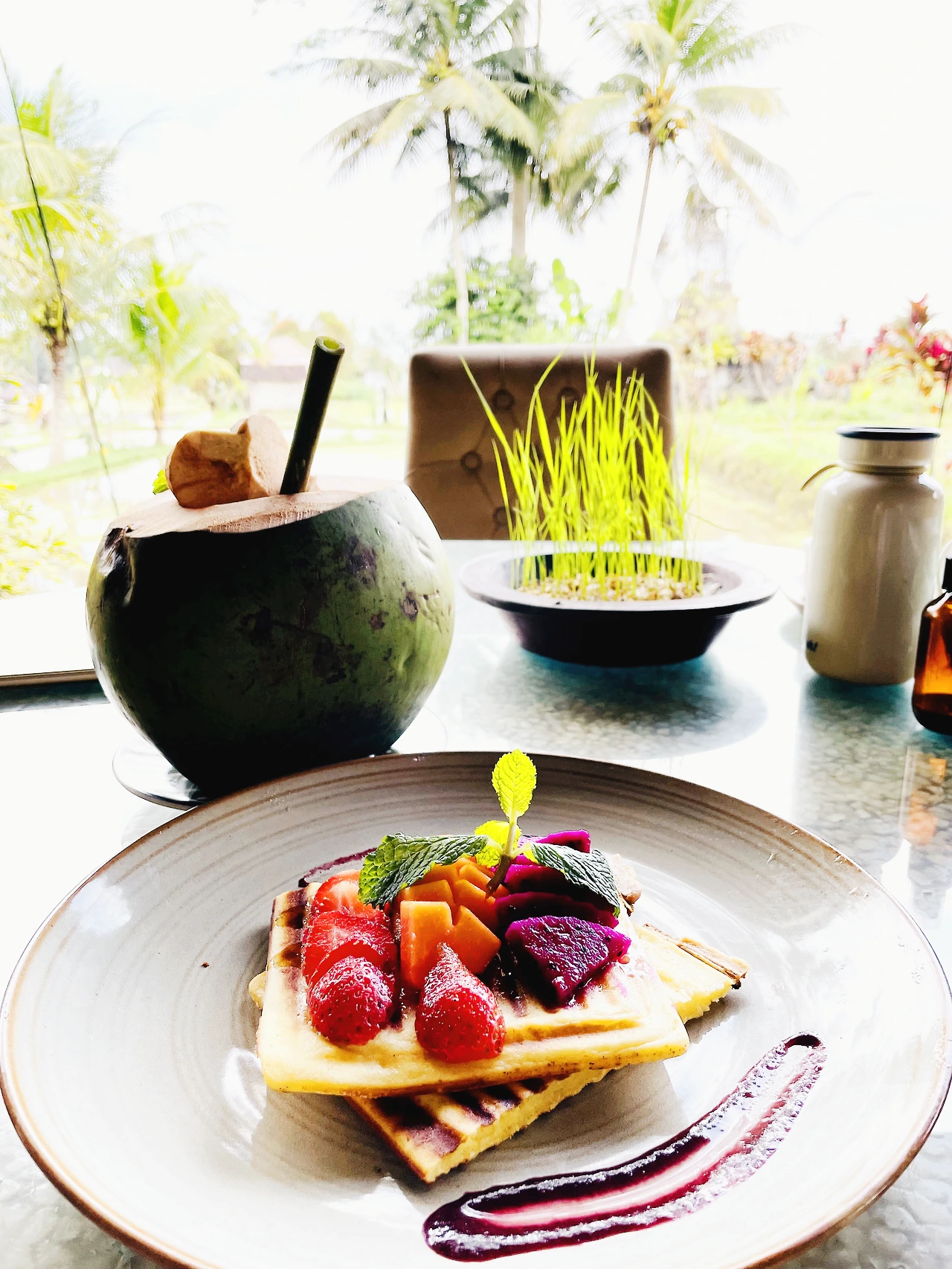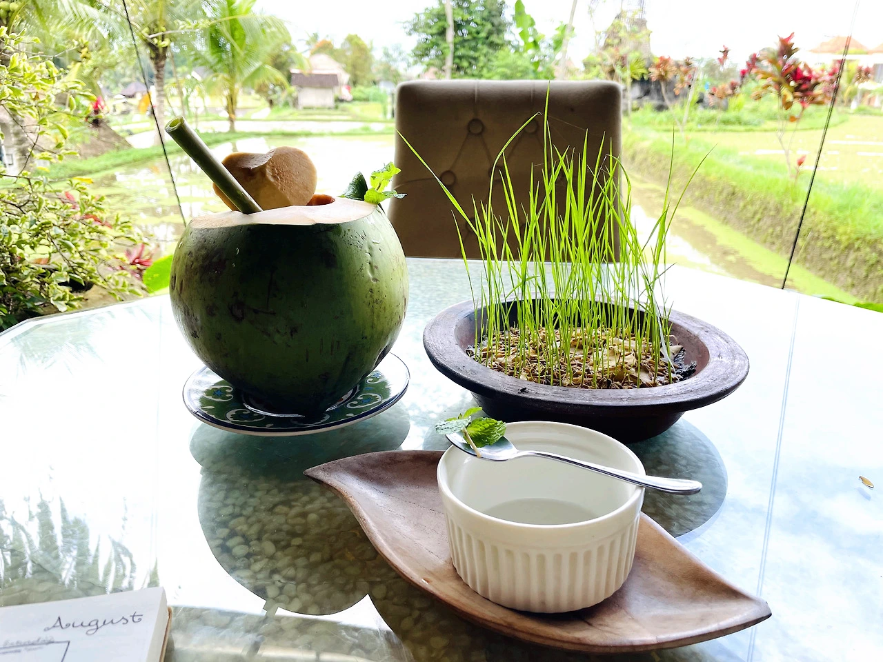구원의 목소리였어요. 두리번거리던 저를 불러 세운 안내프론트의 그녀에게 아카샤를 찾는다고 하자 여기가 바로 아카샤라며 빌라를 찾는지 아니면 식당을 찾는지 물었어요. 식당이라 하자 오른쪽으로 들어오라며 상냥히 안내해 줘 커다란 눈이 맑고 시원한 그녀를 따라 들어갔어요. 예상보다 럭셔리하고 드넓은 식당은 아침이라 손님이 저 혼자뿐이었고 멋진 인테리어와 평화로운 경치에 눈의 감각이 환해지고 기분이 몽글몽글 들뜨기 시작했어요. 벼를 베고 물만 남은 탁 트인 논에 오밀조밀 다닥다닥 붙어 떠있는 귀여운 개구리밥과 파파야빛 지붕집들, 건강한 야자나무, 흐리지만 구름이 풍성한 하늘을 바라보니 속세의 찌든 때까지 말끔히 씻겨나가며 힐링이 시작됐습니다.