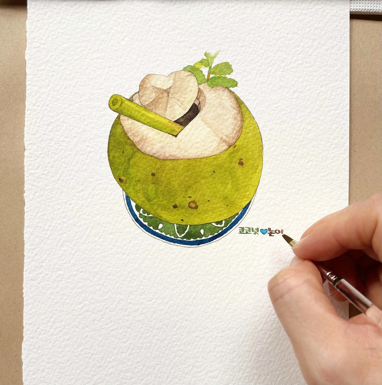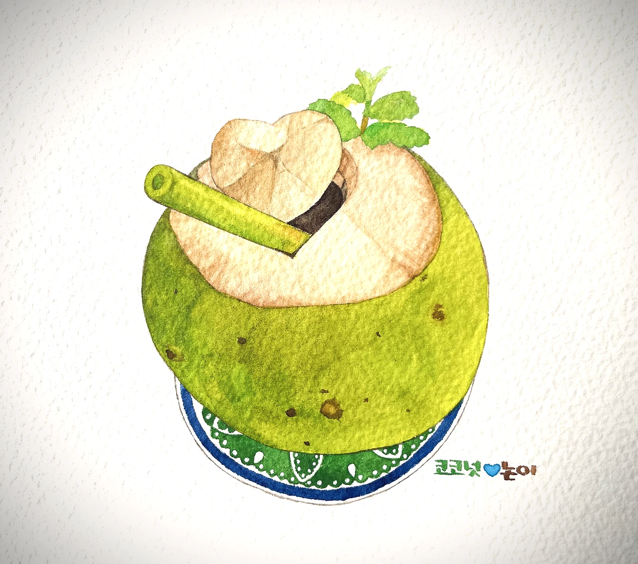 코코넛열매 안에 든 물을 마시기 위해 무겁고 단단한 코코넛 윗동을 날카로운 칼로 자르는 작업은 생각보다 보통 일이 아닙니다. 지난 4월에 들른 누사페니다 섬에서 찌는 듯한 더위를 피해 들어간 가게에서 코코넛을 시켰을 때 즉석에서 바로 코코넛을 도끼만 한 칼로 묘기 부리듯 잘라내는 아주머니를 보고 눈이 휘둥그레졌었어요. 보는 사람 간담이 서늘해질 만큼 무시무시한 칼쇼였어요. 저러다 손이라도 다치면 큰일 나는데.. 조마조마한 마음에 무사히 코코넛 자르시라고 아주머니의 안전을 위해 속으로 기도했어요. 고도의 몰입과 집중력으로 칼질하던 대담한 아낙의 손놀림을 떠올리며 눈앞의 코코넛을 바라보니 이 귀여운 하트 뚜껑을 섬세한 손길로 새로이 탄생시킨 분께 절로 고개가 숙여졌어요. 윗동을 쳐내는 일도 힘든 노동인데 잘라낸 윗동을 하트모양으로 조각해 구멍 내는 훌륭한 작업을 해내신 분은 도대체 어떤 분일까 궁금해졌습니다. 작은 일에 감동받고 두 손 모아 감격하기 좋아하는 누군가가 이 작은 하트모양에 기분이 한없이 들뜨고 행복해져 그림까지 그리게 되리라는 걸 그분은 알고 계실까요?