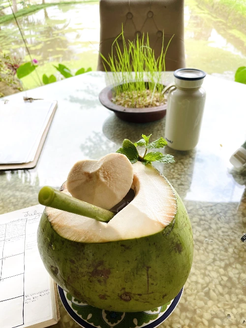 주문한 코코넛과 비건 아이스크림이 나왔을 때 심장이 쿵 하고 내려앉았어요. 코코넛 뚜껑이 로맨틱한 하트모양이었기 때문이에요! 내 사랑 코코넛이 이렇게나 아름다운 모습으로 나타나다니 역시 어디든 예술적인 감각이 충만해 감격스러운 발리입니다. 언젠가 라디오에서 들은 얘기론 발리 우붓에선 결혼적령기의 남자가 나무 숟가락을 만들어 사랑하는 여자에게 건네며 청혼을 하는 전통이 있다고 해요. 예술적 감각이 흘러넘치고 손재주 많은 발리사람들이 많은 줄은 알고 있었지만 직접 나무를 깎아 숟가락을 만들어 결혼해 달라고 하다니 정말이지 낭만적이고 소박하며 아름다운 전통이 아닐 수 없습니다. 핸드메이드 숟가락을 선물 받고 남자가 마음에 썩 들지 않더라도 그 정성을 생각해서 결혼해 줬을 마음 착한 여자들이 존재했을지도 모르겠어요.