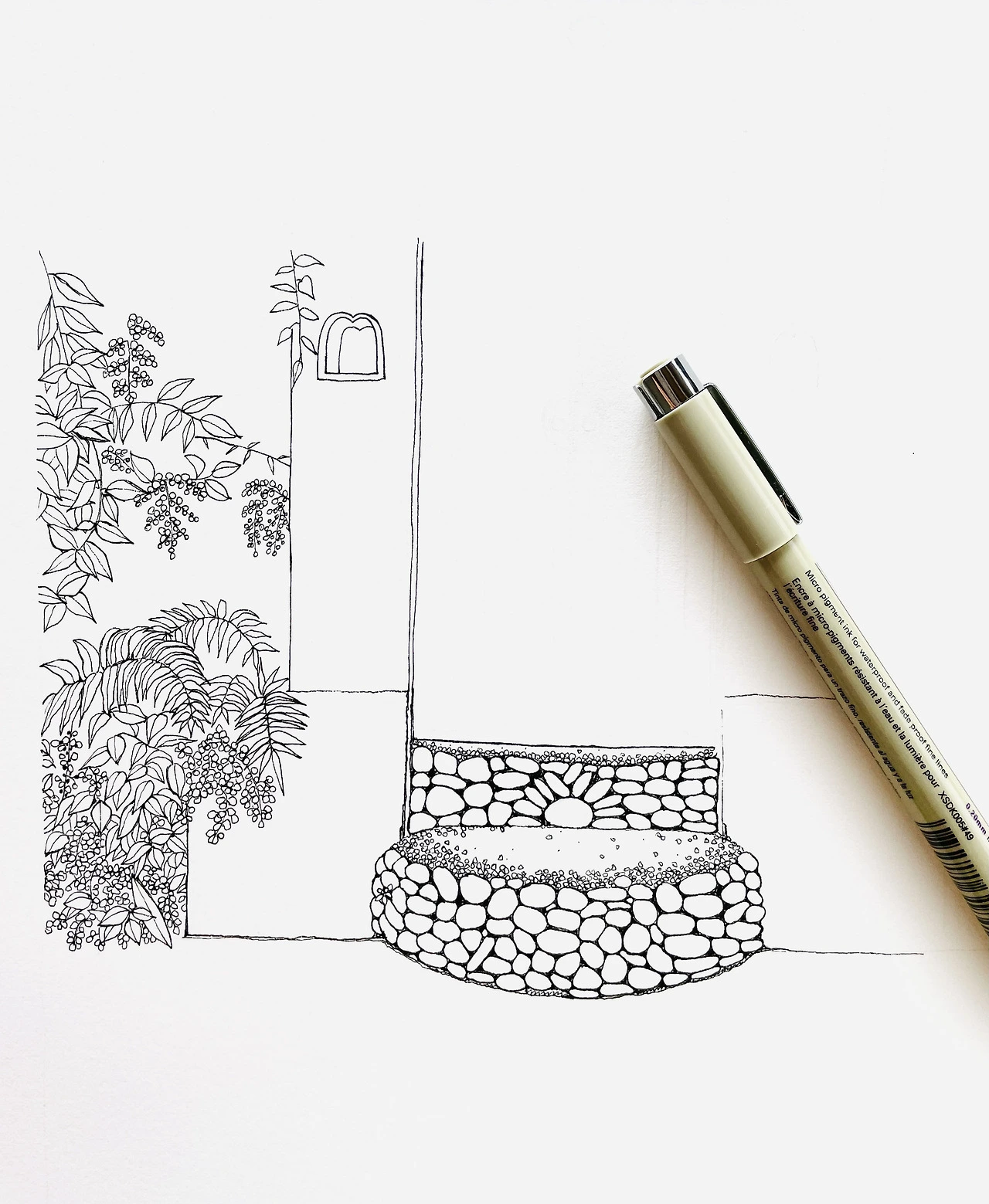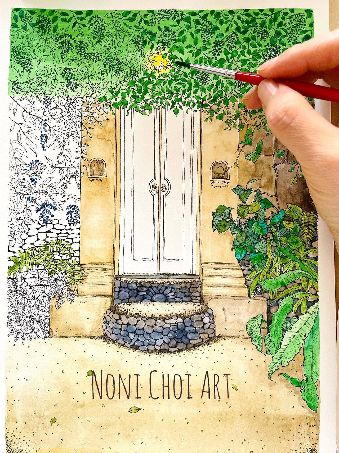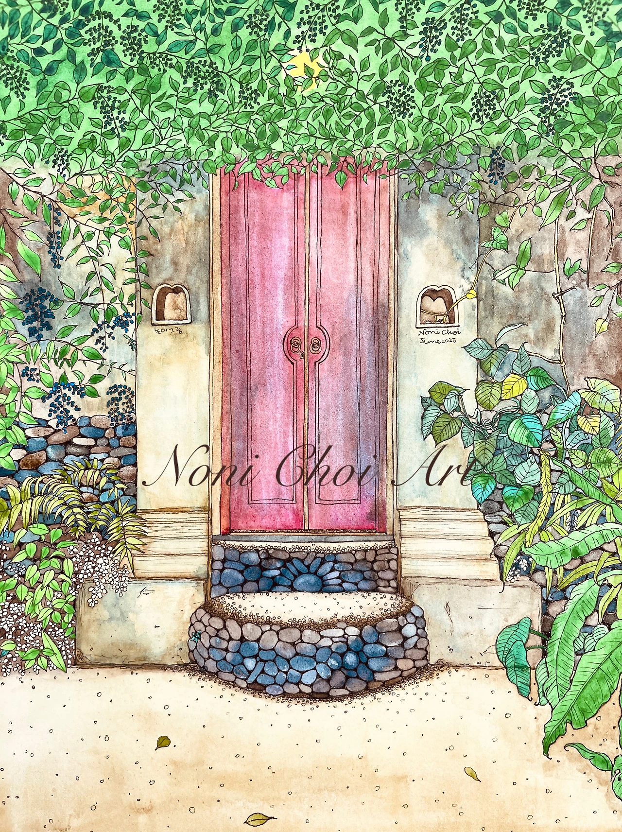 그 산책로에서 발견한 어느 아름다운 집의 현관을 그려보았어요.