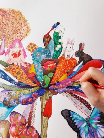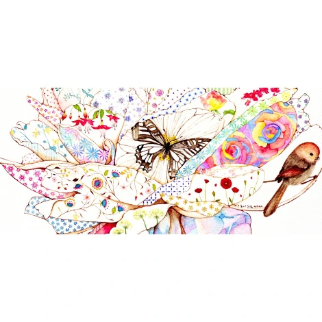종이 위에 혼합재료. 노니 그림 2021. 엽서쓰는 소녀는 아니지만 꽃 위에서 책 읽는 요정과 여러 동물들.
