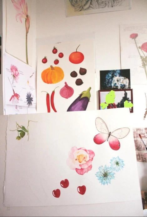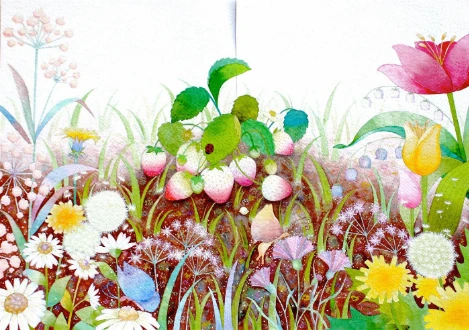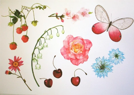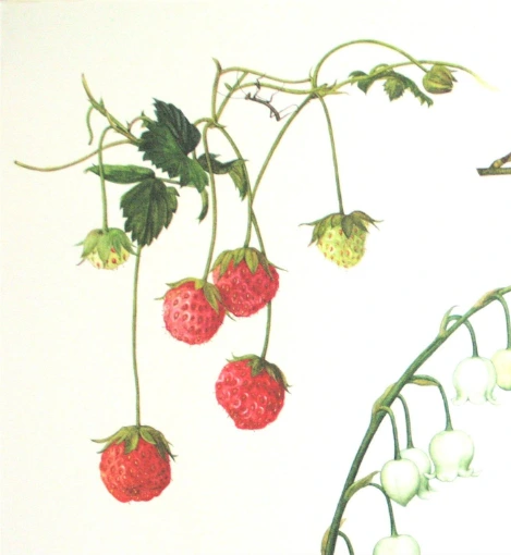 종이 위에 수채. 식물화 디플로마 과정 마지막 작품. 제가 직접 길렀던 유기농 딸기를 그렸어요. 잘 보면 사마귀도 보입니다. 사마귀가 딸기 줄기 위에 붙어 앉아 쉬는 모습이 평화로워 보이죠? 노니 그림 2016