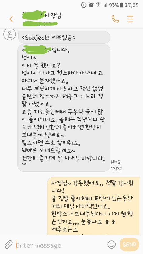 감동이었어요. 친환경 귤 한 박스라니! 게다가 정성 들여 쓴 손글씨까지.. 너무나 감사했습니다. 코로나로 인한 비대면 서비스로 딱 한번 마주치고 문자로만 대화했던 터라 더 감동이었어요.