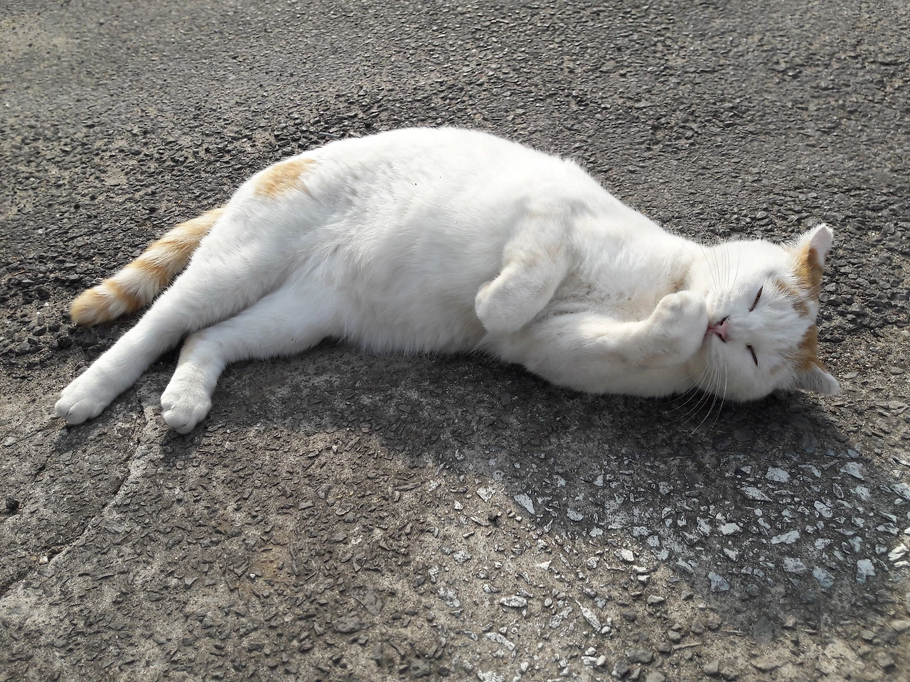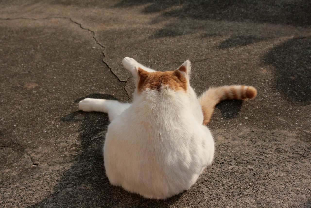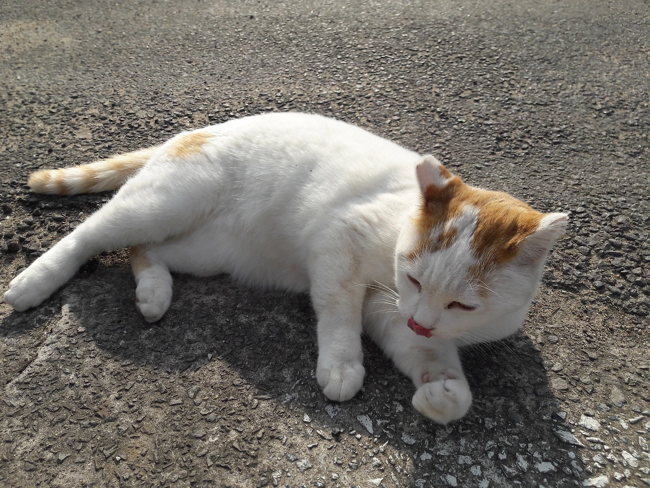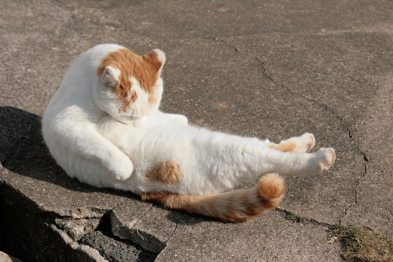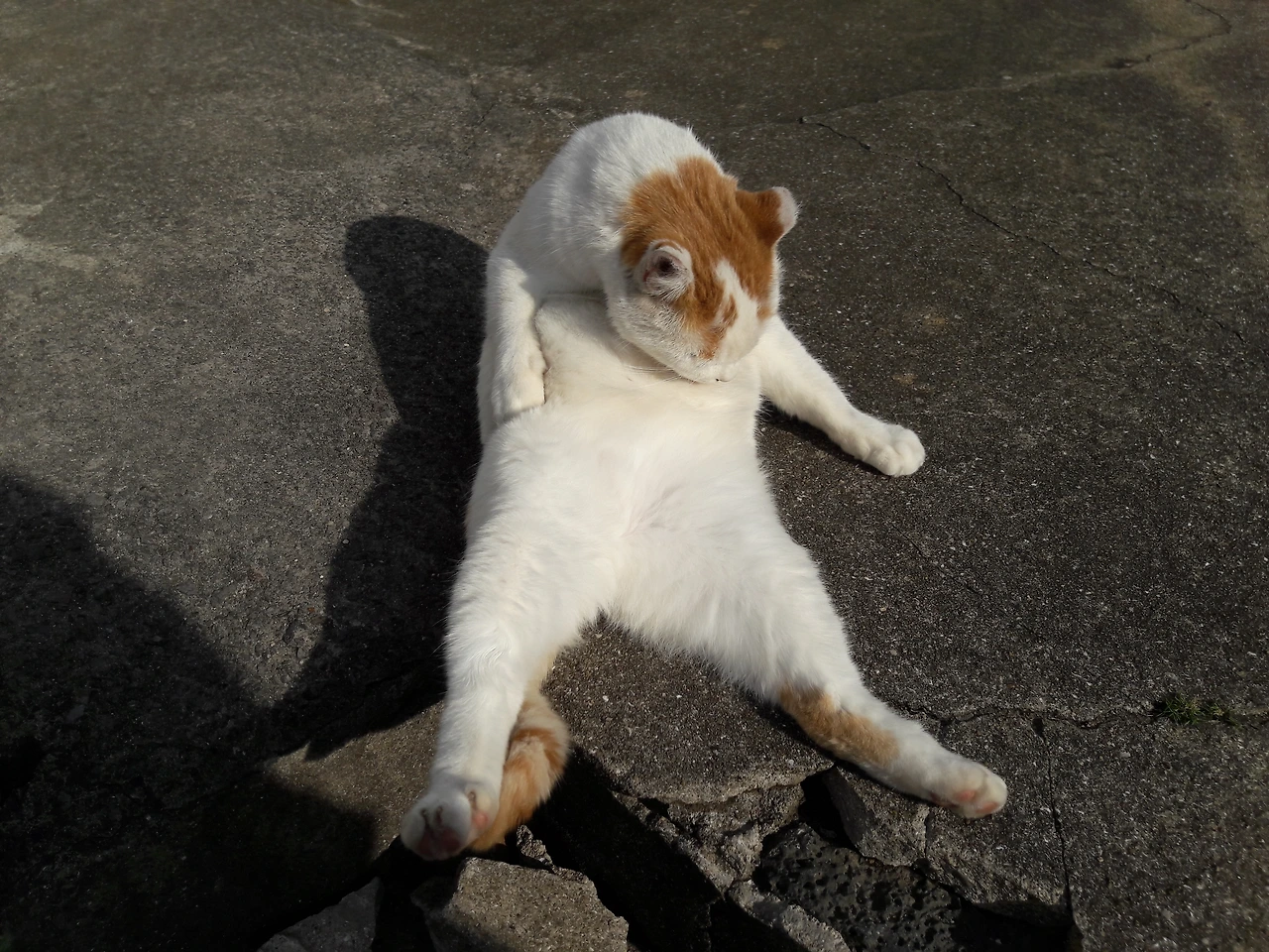 그루밍하는 모습의 흰둥이. 배에 난 털을 열심히 입으로 손질 중이예요. 힘들어 보이는 포즈지만 제일 귀엽고 사람같아서 웃깁니다. 고양이 유전자의 90%가 인간과 동일하다는 연구결과가 있듯이 고양이는 우리와 비슷한 점이 많고 지능이 개보다 높을만큼 똑똑합니다.