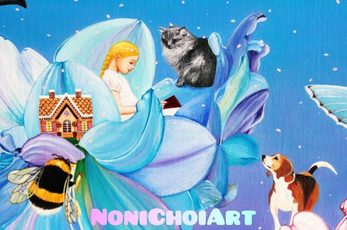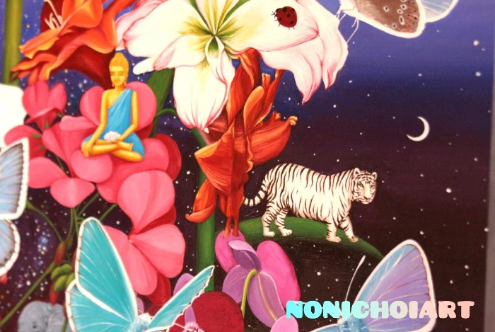 흰호랑이와 부처님을 꼭 넣어달라는 브로닌의 그림 주문으로 그리게 된 유화입니다. 자작나무 패널 위에 유화물감. 노니 그림