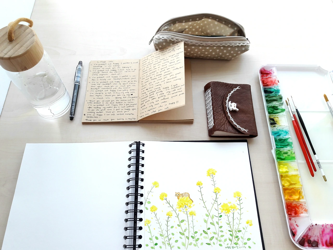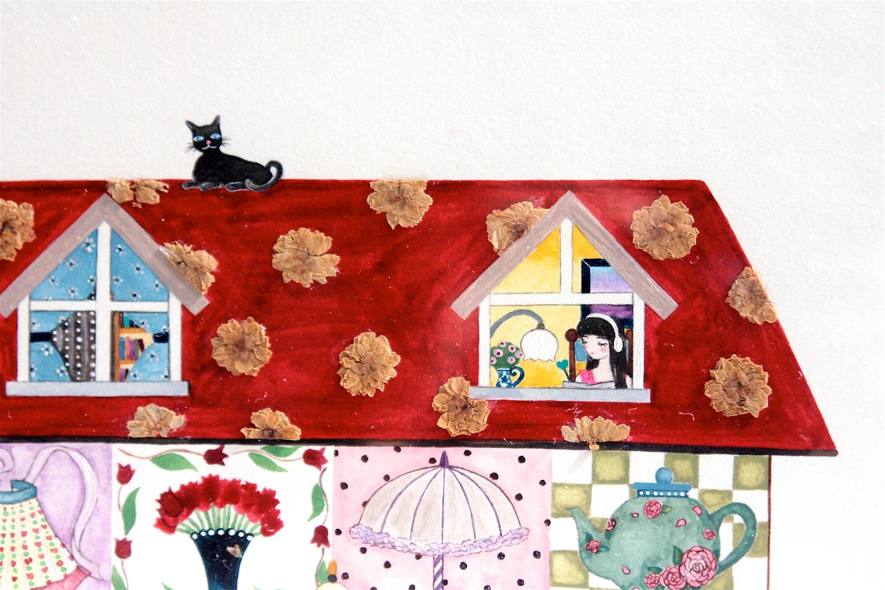 유채꽃위의 작은 식빵. 작은 종이 위에 수채, 펜.
