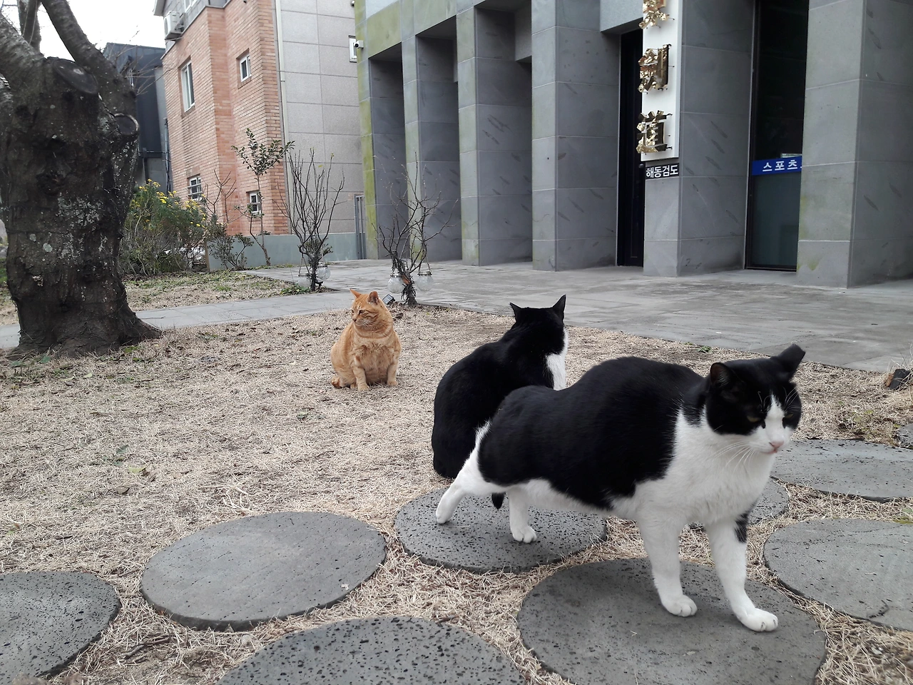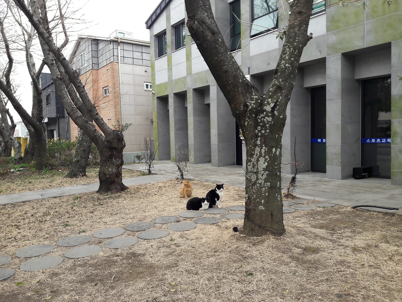 요즘 가장 친하게 지내는 동네 고양이 세마리입니다. 디카프리오, 엘리자베스, 브래드피트 라는 이름을 지닌 길냥이들은 검도장 원장님이 늘 푸짐한 사료와 고기 파우치, 물을 챙겨주시는 덕에 이곳에 항상 상주하고 있어요. 도장 어린이들이 지어 준 아메리칸 스타일의 이름이 특이하죠?