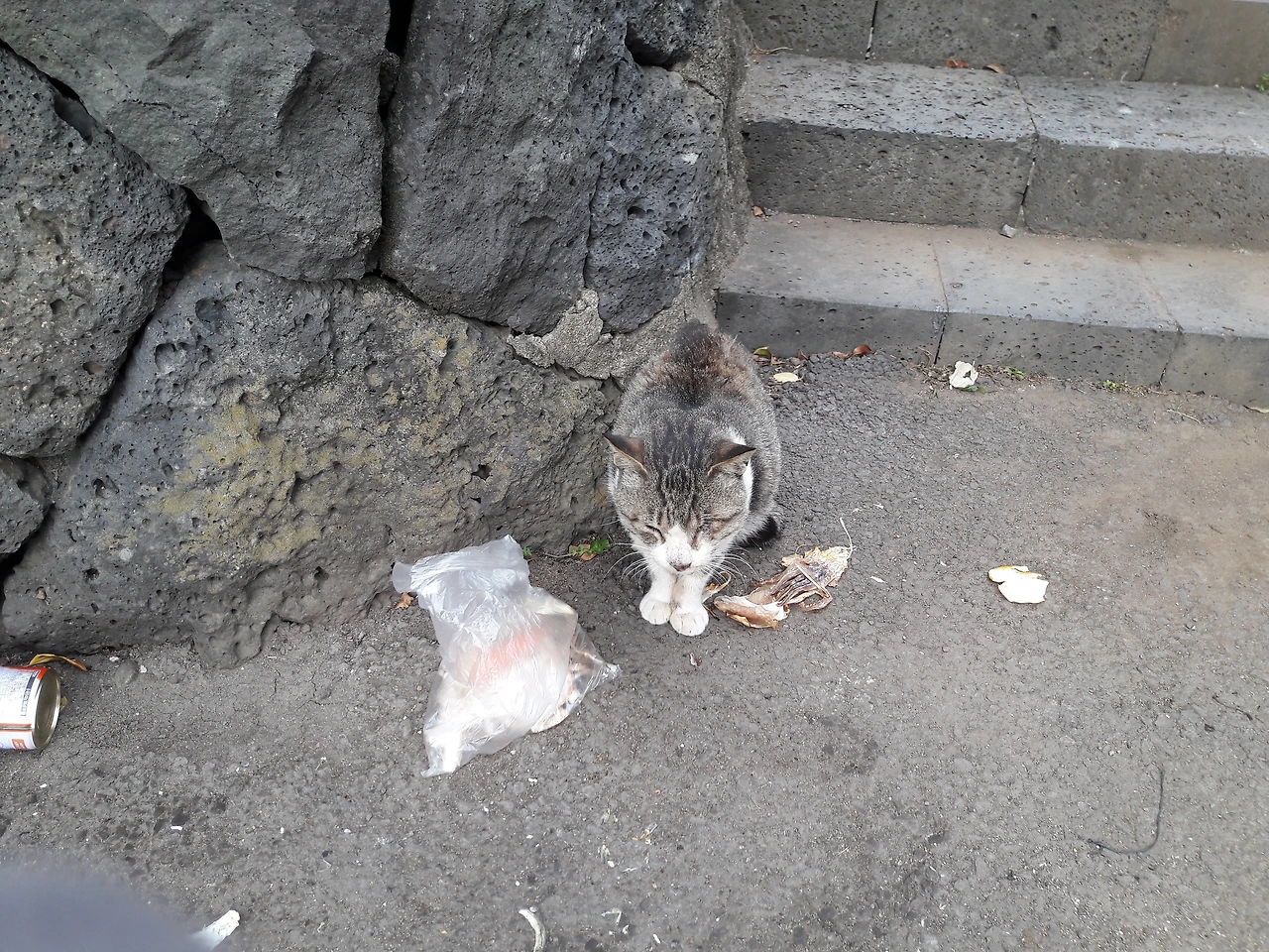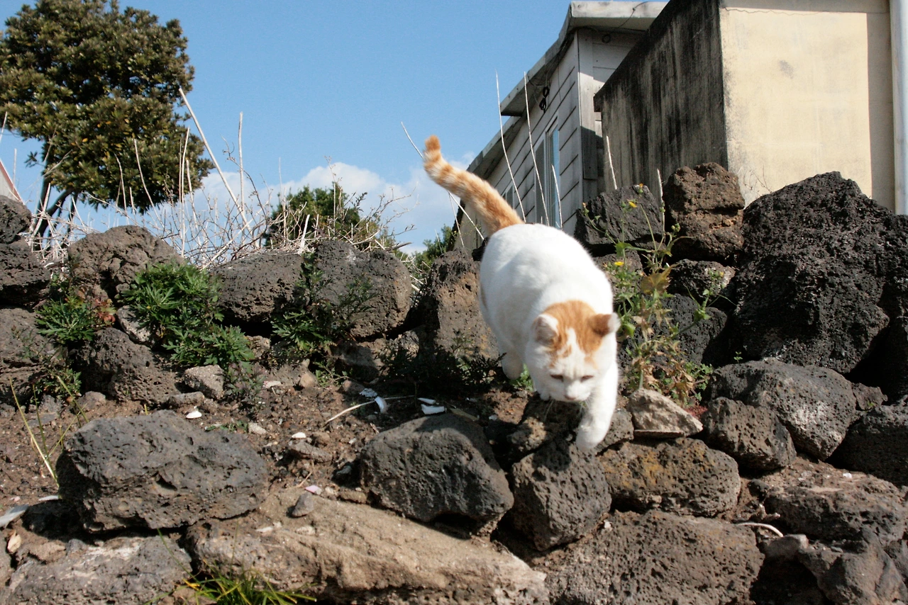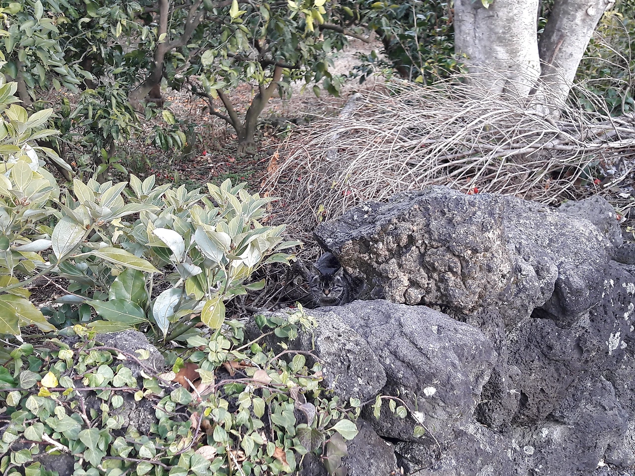 즐겨가는 올레길로 가는 길에 발견한 길고양이. 고등어냥이 너무 귀여워 조금씩 다가갔지만 부담스러웠는지 바위뒤로 쏙 숨어버렸어요.