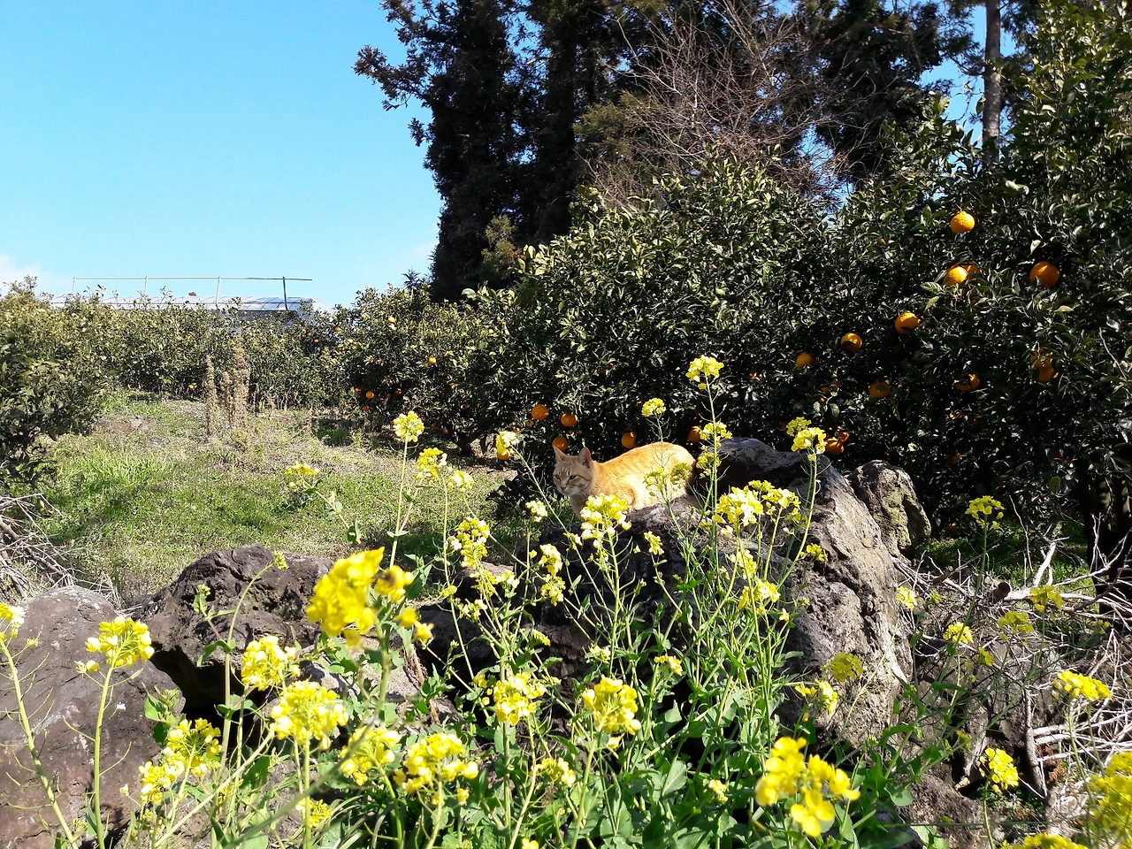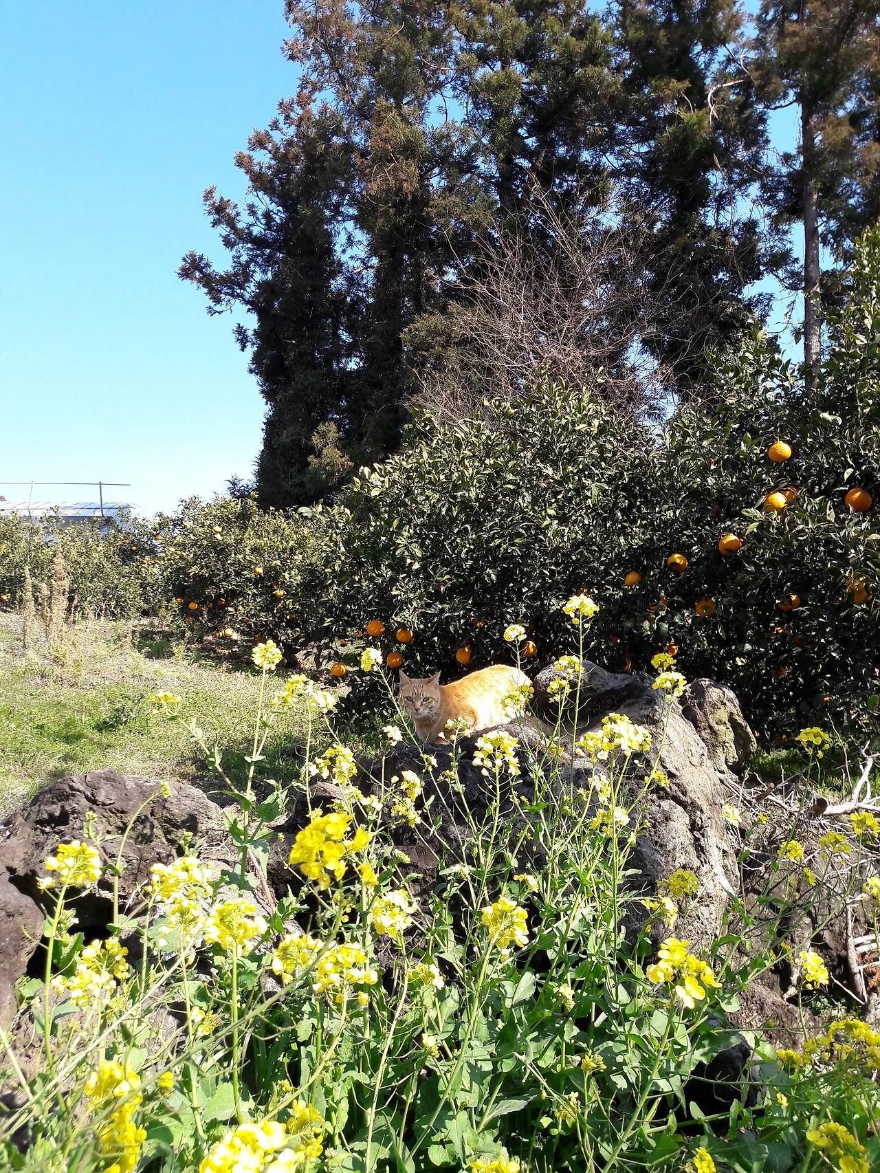 바닷가로 가는 길, 밀감밭 앞에 예쁘게 피어난 유채꽃 한아름을 보자마자 나타난 노란 치즈냥입니다. 저를 보고는 유채꽃 뒤에 즐비한 바위 위로 사뿐히 오르더니 제주 햇살과 뜨끈한 바위를 오븐삼아 한참을 식빵 굽던 신비로운 고양이예요. 눈 부시도록 선명하고 상큼한 유채꽃 사이 새초롬히 앉아있는 모습에 취해버립니다.