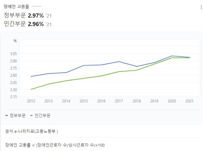 고용노동부 장애인 고용률 조사에 따르면 2021년 기준 정부부문은 2.97%, 민간부문은 2.96%에 그치고 있다. 물론 매년 점진적으로 증가하고 있으나 고용부담금 납부나 명단 공표등 제도적 압박에 의한 수동적 변화일 수도 있고 공단 차원의 고용컨설팅 등을 통한 적극적인 지지 체계 마련도 하나의 영향일 수 있을 것이다.